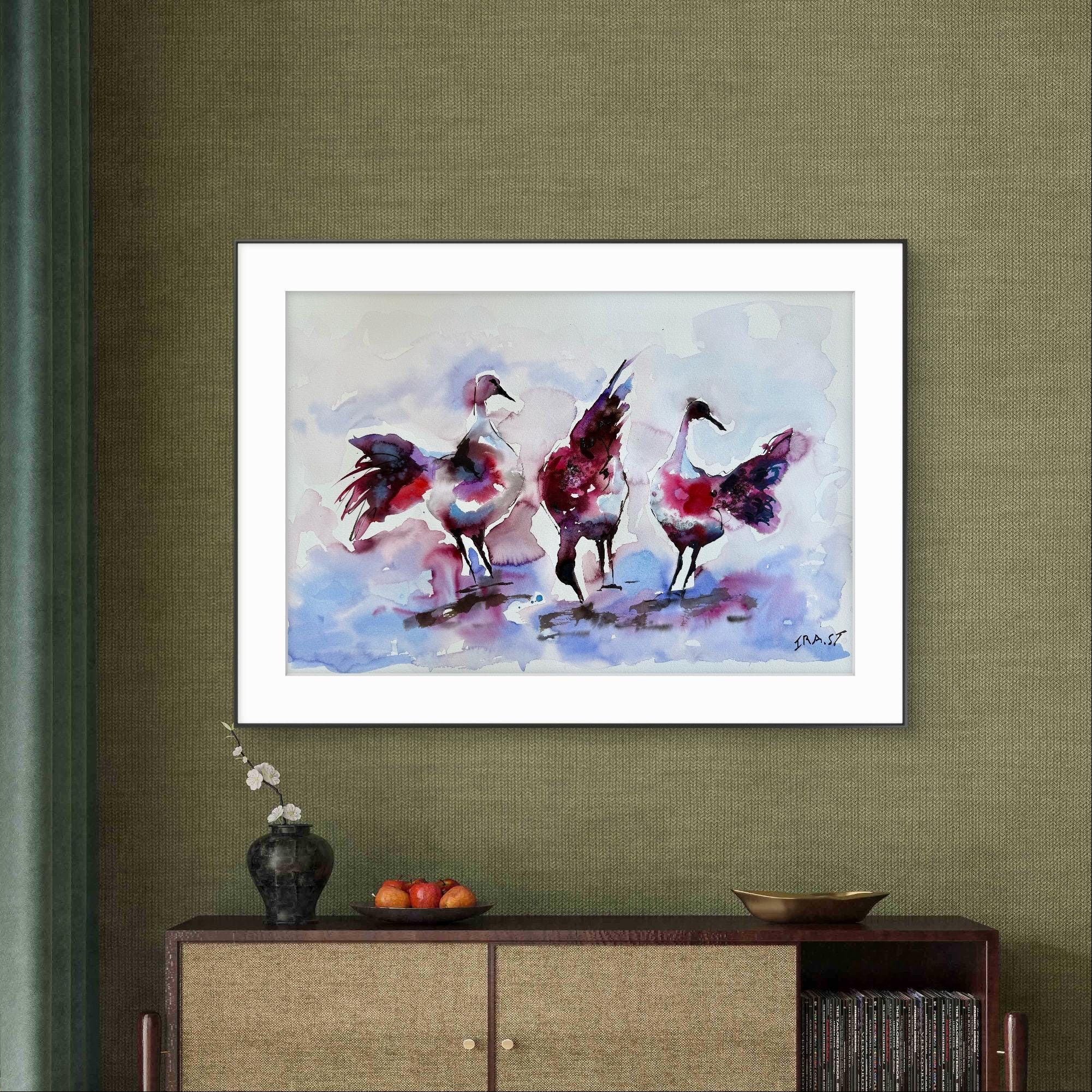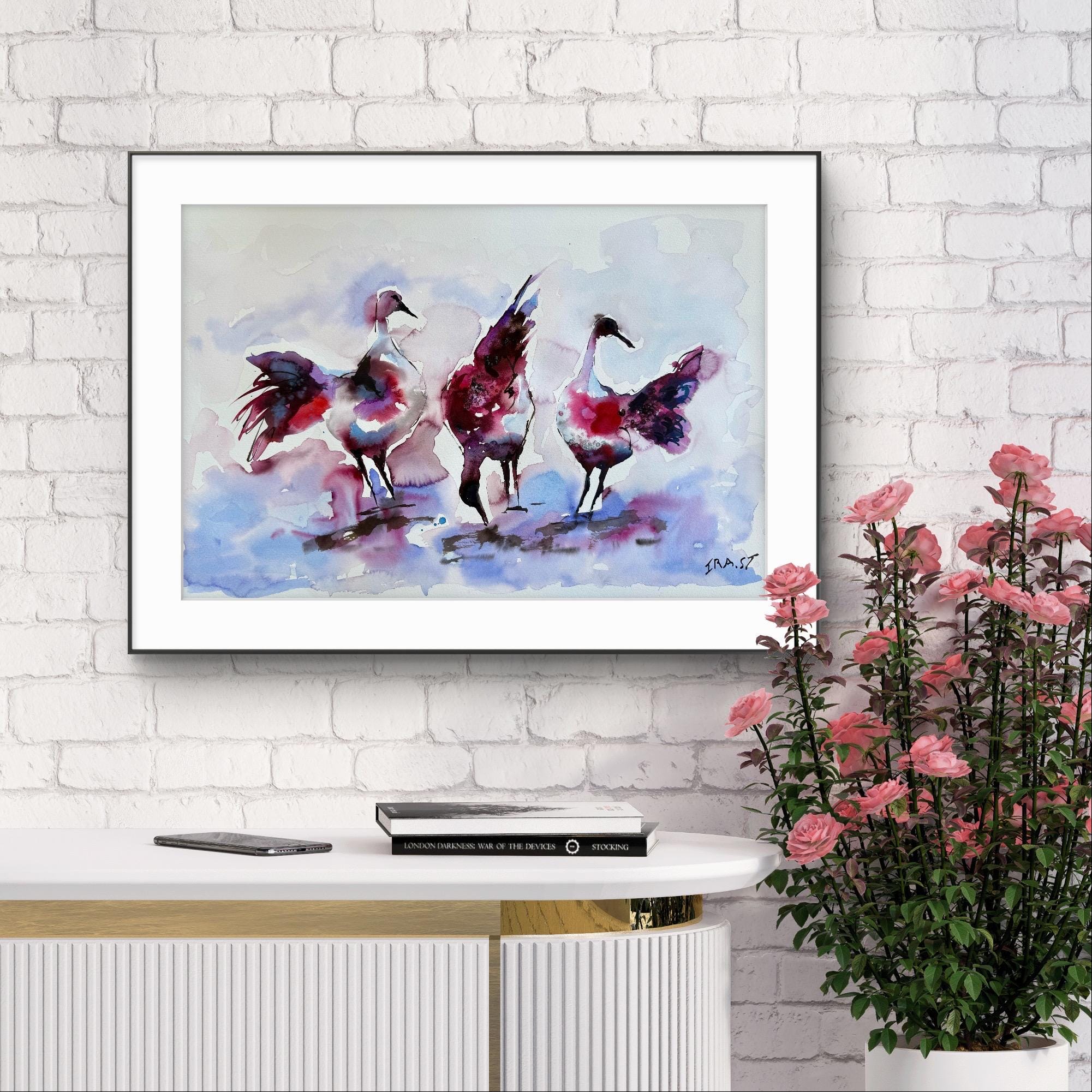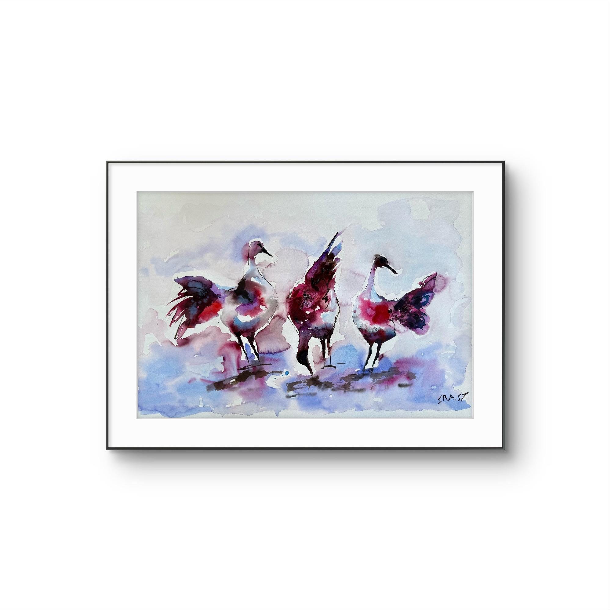 ציור מקורי בצבעי מים זה הוא יצירה אחת מסוגה, בהשראת האהבה שלי לציפורים ולעגורים בטבע. הציור מציג שלוש ציפורים מופשטות בתנועה אלגנטית, בגוונים של סגול, ורוד, כחול ובורדו עמוק.