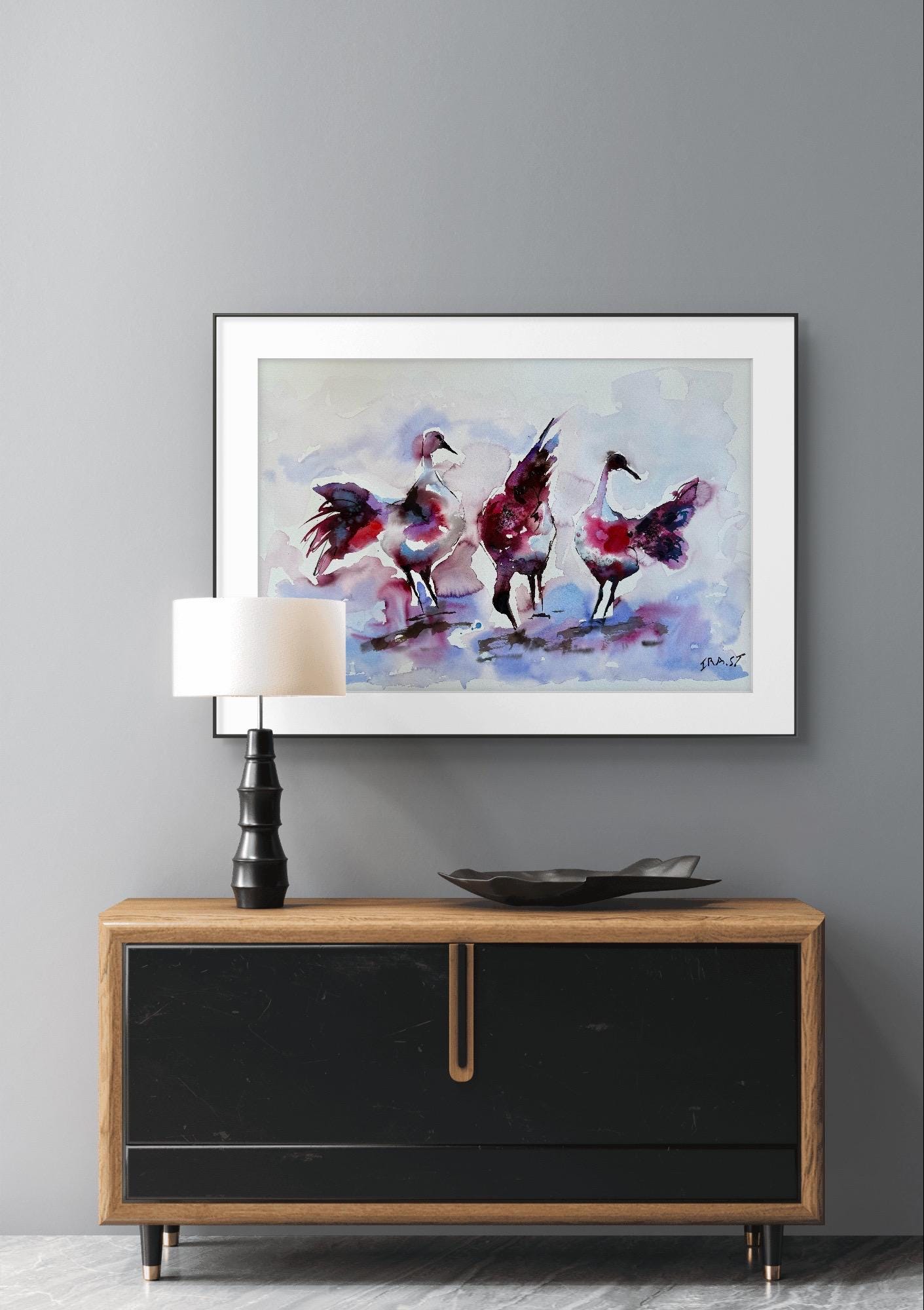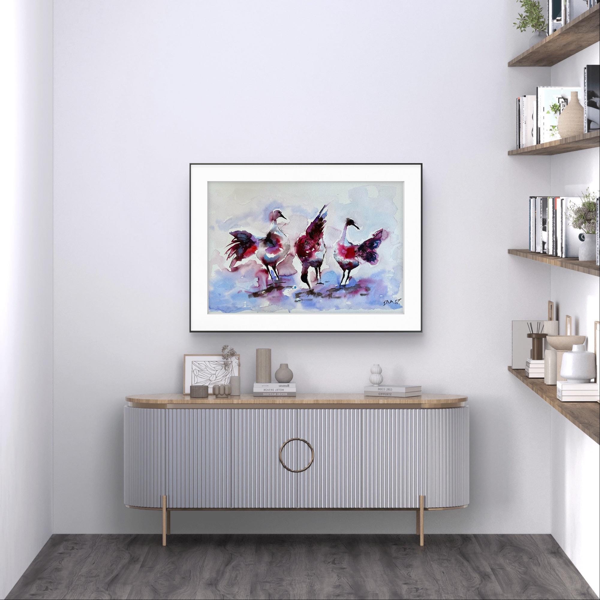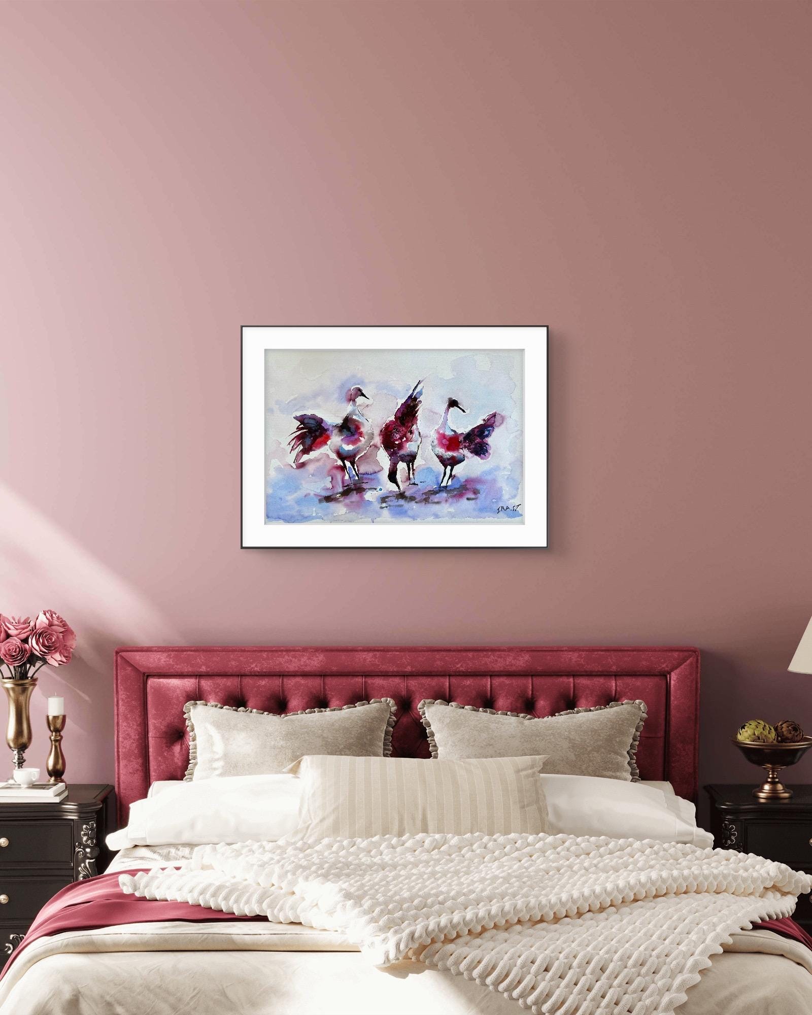 ציור מקורי בצבעי מים זה הוא יצירה אחת מסוגה, בהשראת האהבה שלי לציפורים ולעגורים בטבע. הציור מציג שלוש ציפורים מופשטות בתנועה אלגנטית, בגוונים של סגול, ורוד, כחול ובורדו עמוק.