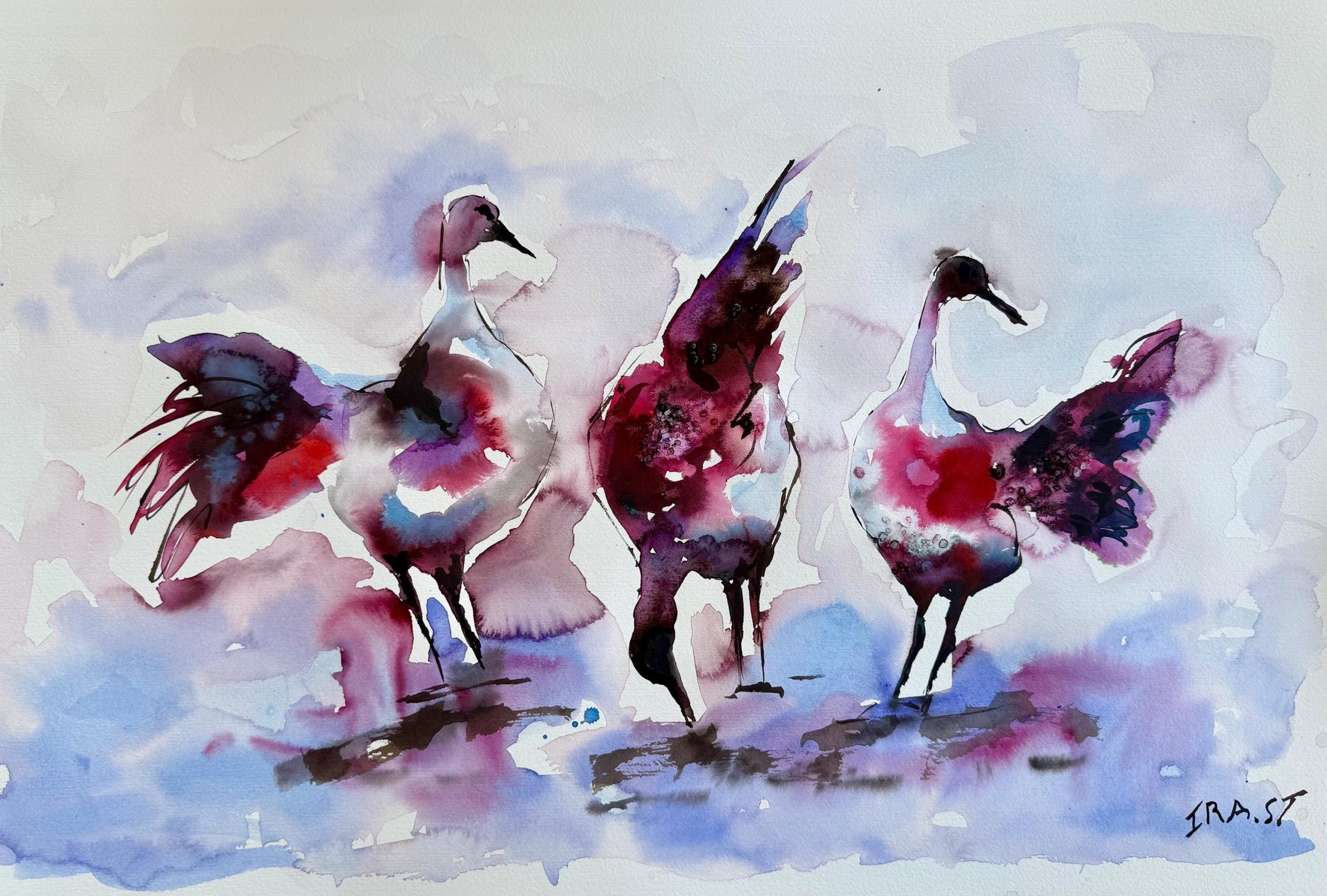 ציור מקורי בצבעי מים – עגורים מופשטות בגווני סגול וורוד עבודת יד
