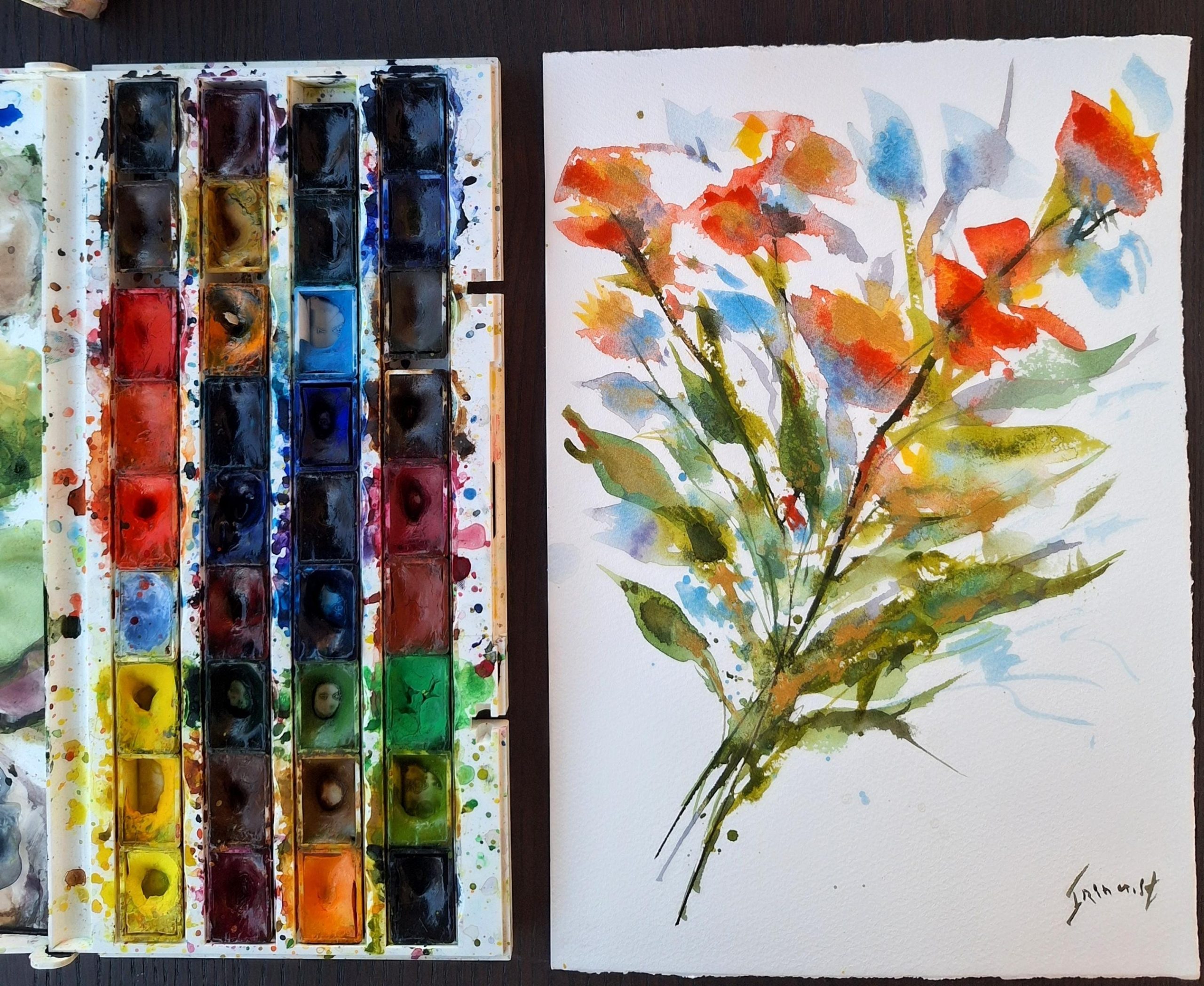 Experience the beauty of nature with this original abstract floral painting, created using vibrant watercolors on premium cotton paper. This one-of-a-kind artwork brings a modern and elegant touch to any space, with its delicate brushstrokes and harmonious colors.