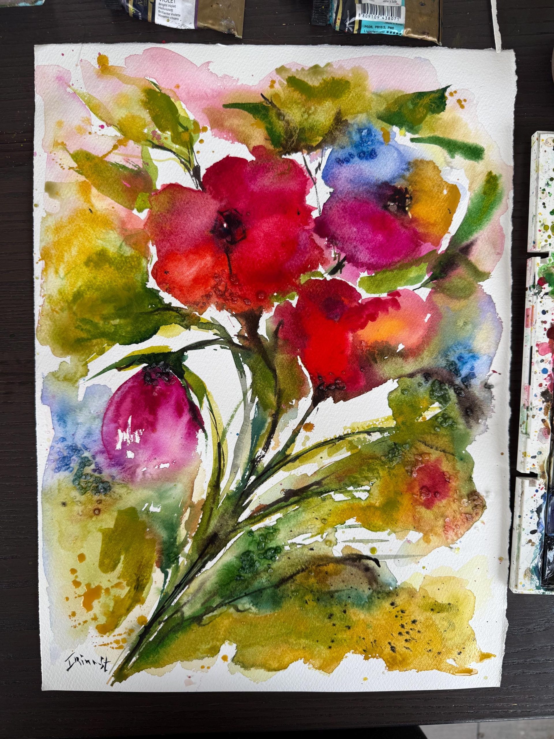 ציור אהבה בפרחים בסגנון זורם בצבעי מים