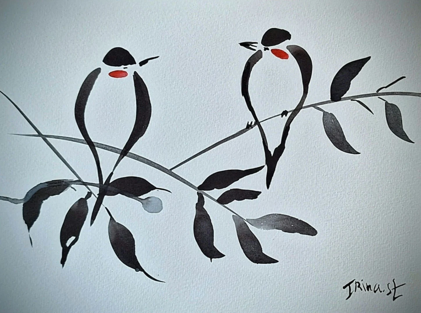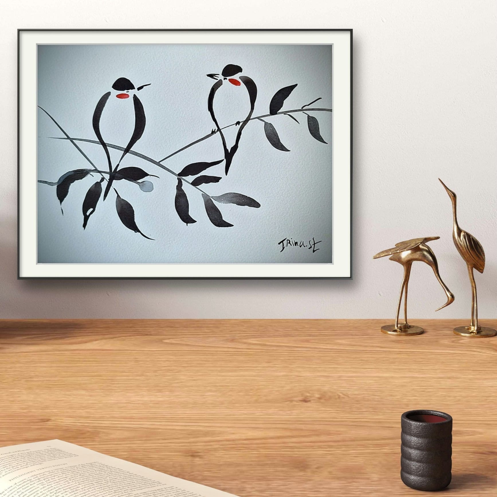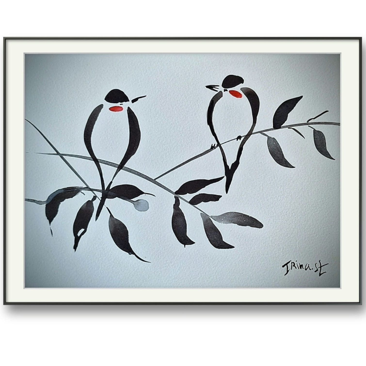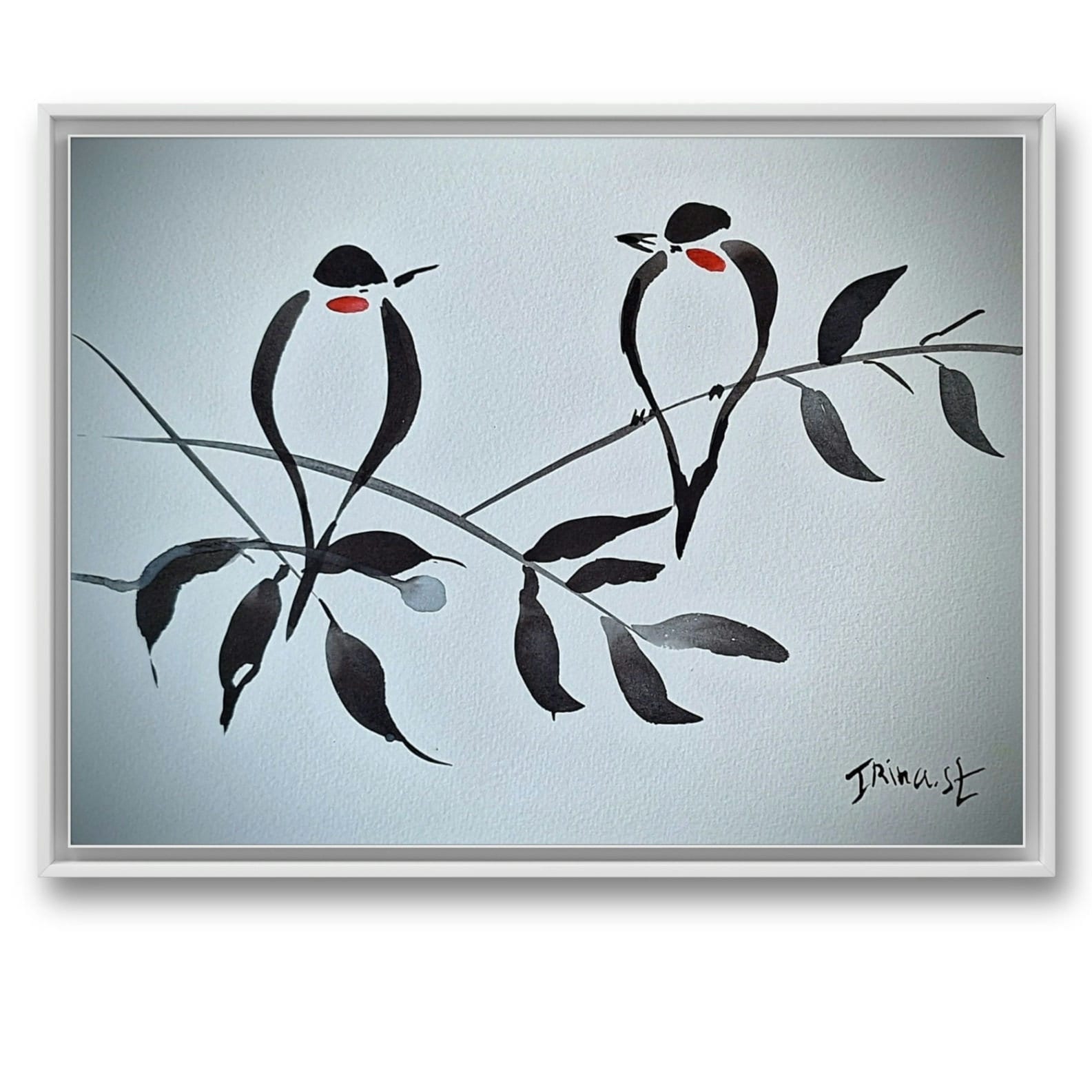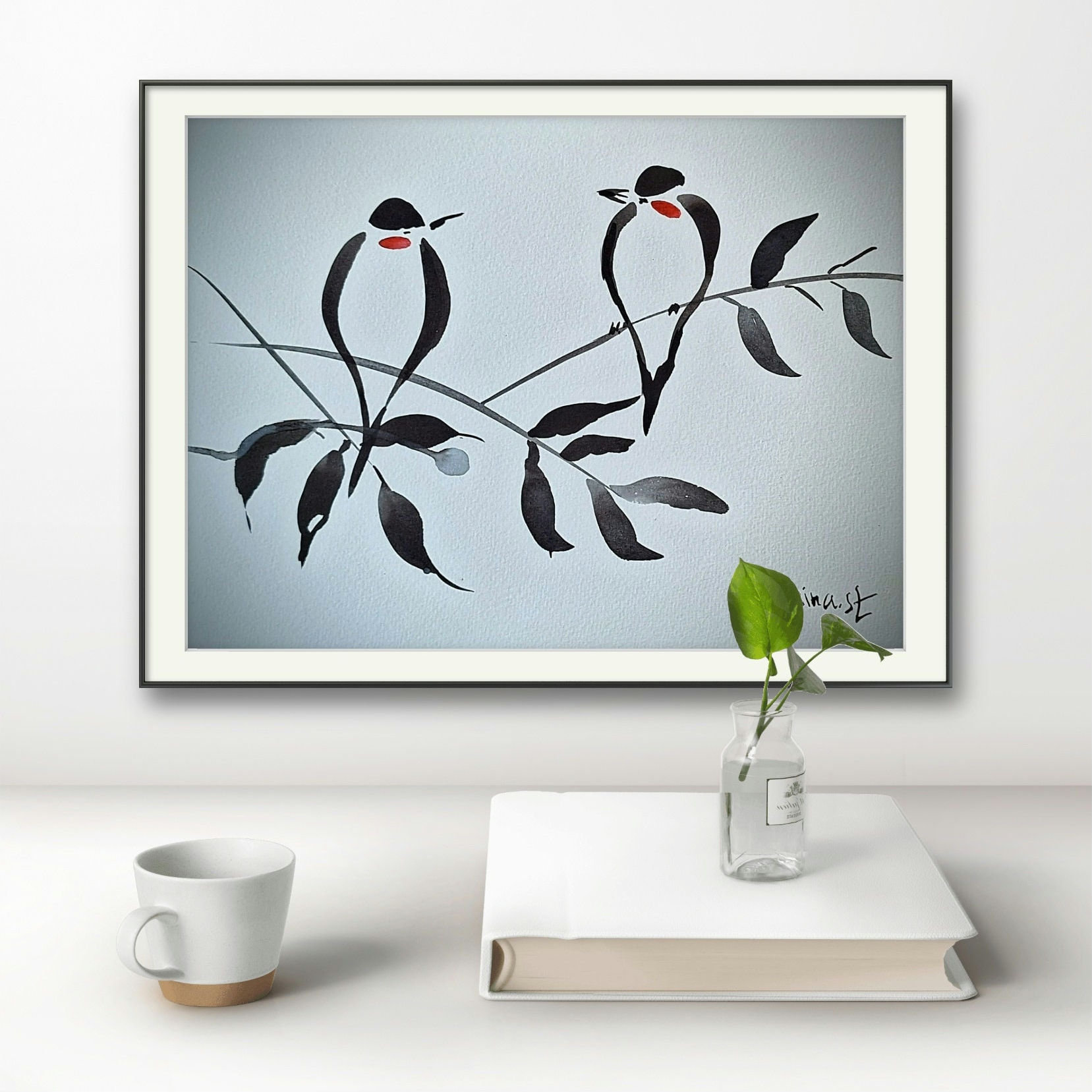 Birds Drawing ORIGINAL Watercolor Painting, Nursery Neutral Bathroom Wall Decor, Gallery Wall Art Single Painting black white ink artwork