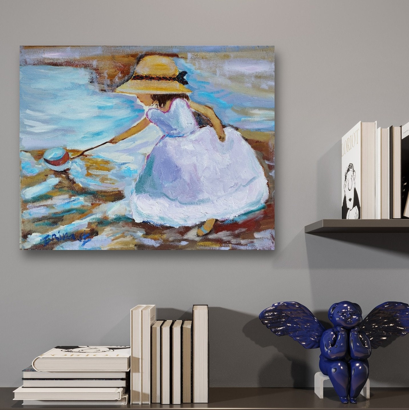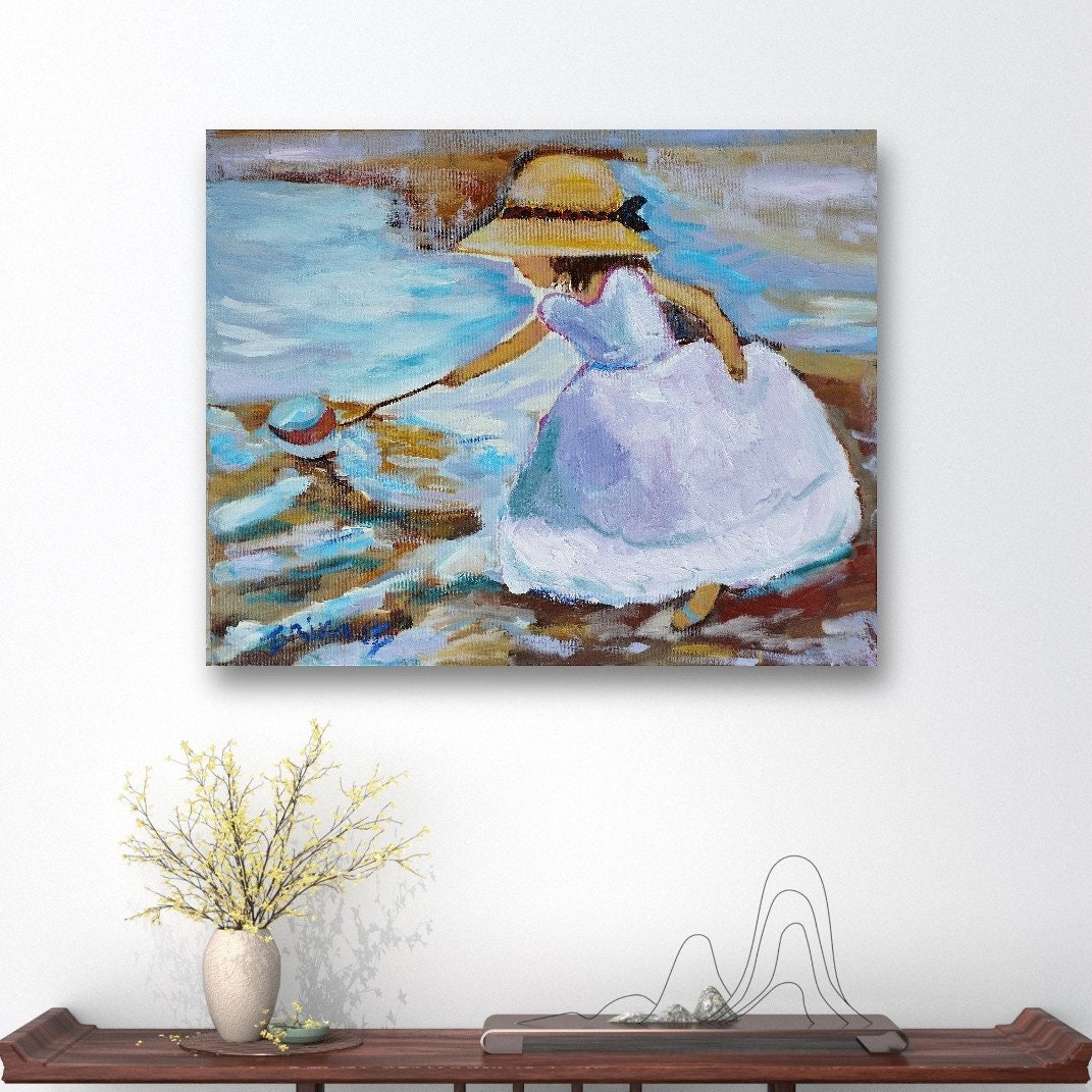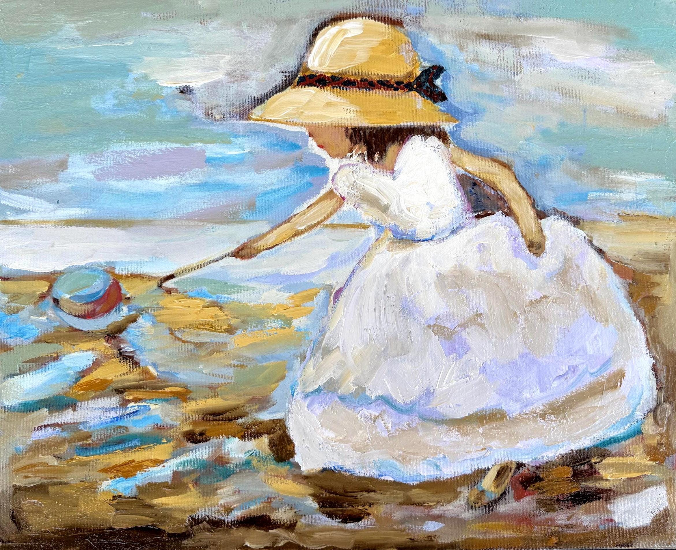 גלו את החן והחיות של הרגע המיוחד הזה עם ציור שמן מקורי זה. הילדה בשמלה לבנה וכובע קש מושיטה את ידה אל כדור צבעוני על חוף חולי, עם משיחות מכחול אימפרסיוניסטיות ורקע של שמיים כחולים ומים. יצירה שמוסיפה צבע וייחודיות לכל חלל.