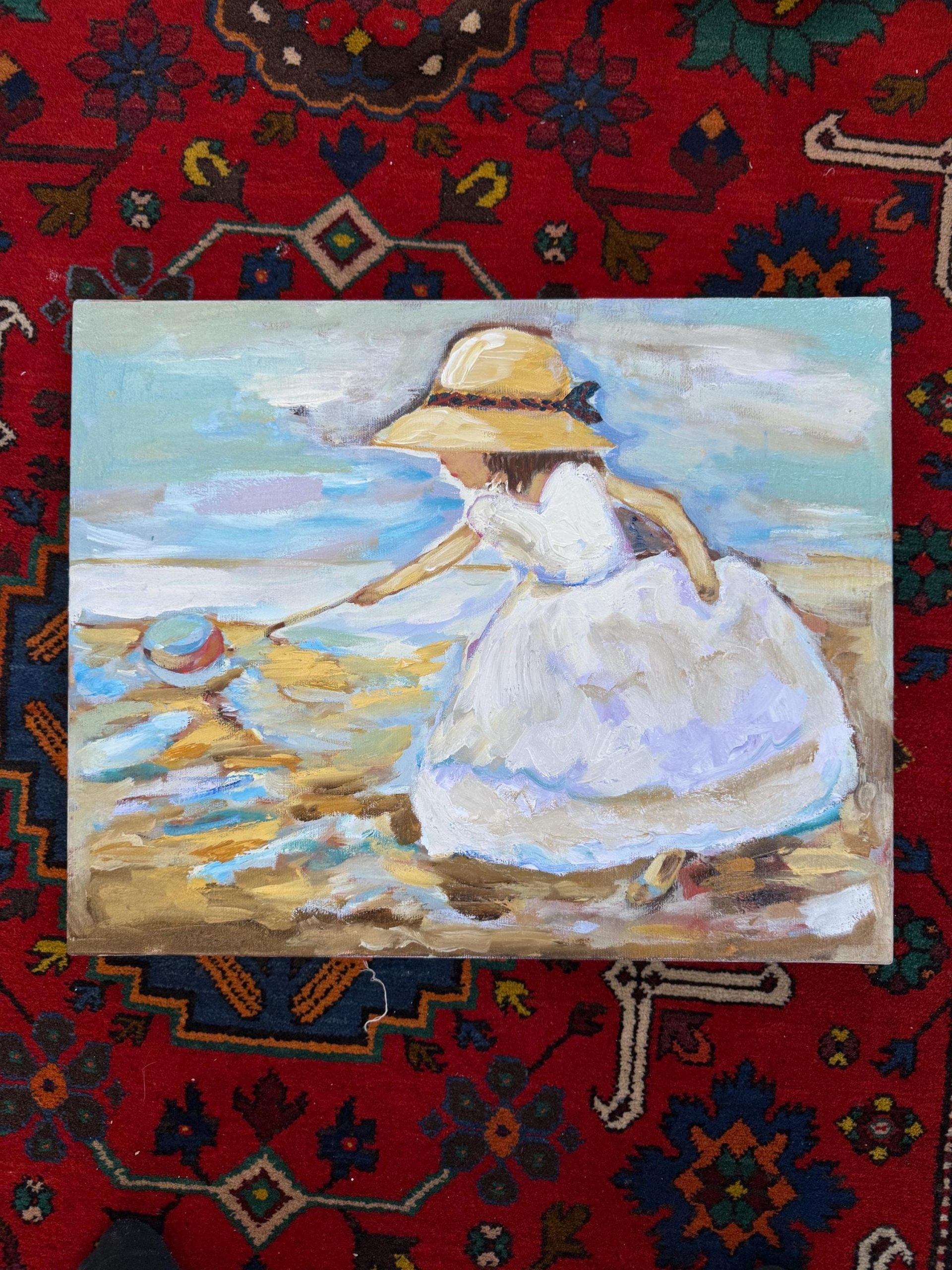 ציור מקורי – ילדה על החוף בצבעי שמן על בד קנבס