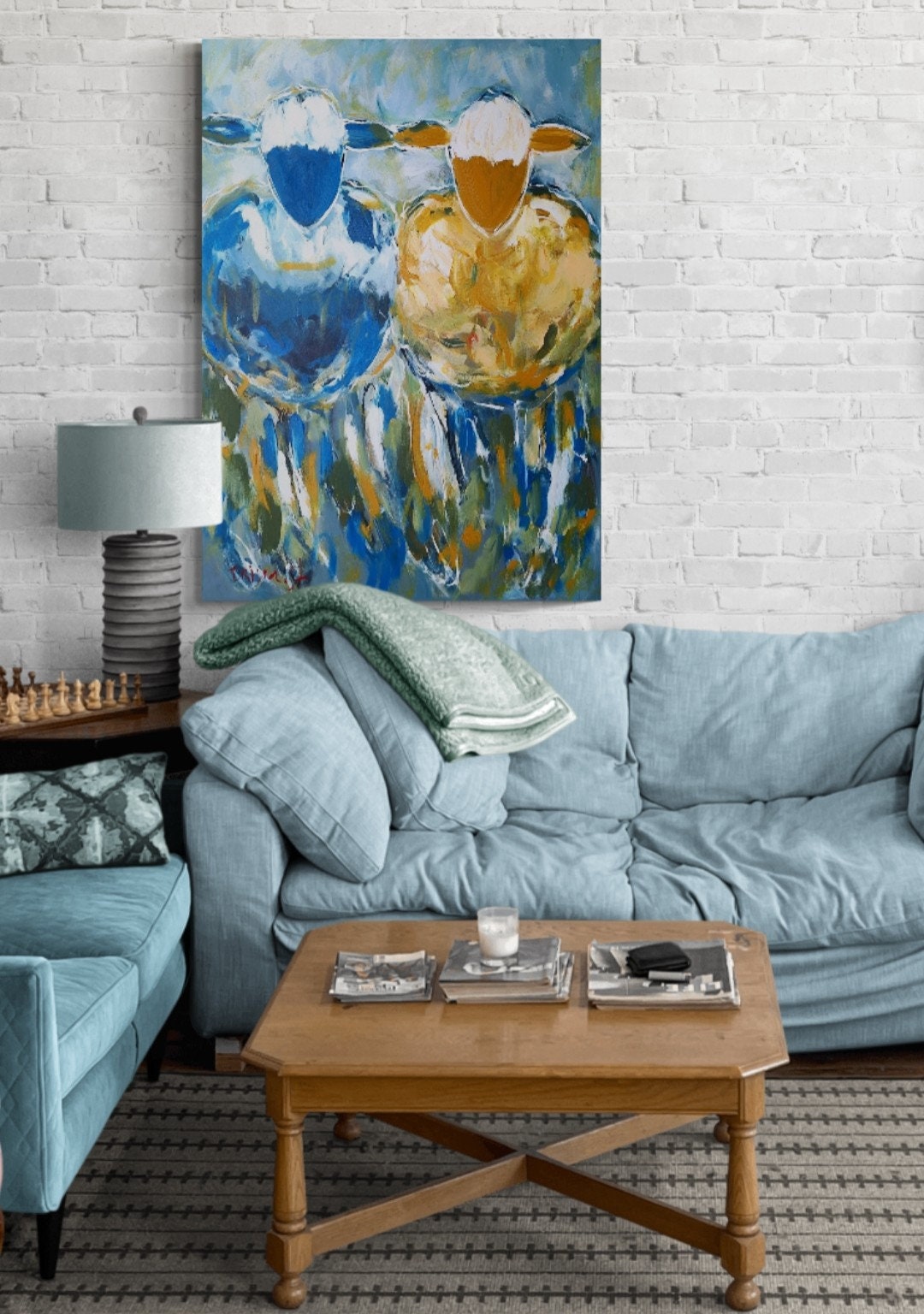 ציור מקורי של כבשים בצבעים חיים ומודרניים, בעבודת יד עם צבעי שמן איכותיים על בד קנבס איטלקי גדול. היצירה בסגנון מופשט ומעוצבת במיוחד כדי להכניס צבע, חיוניות ואווירה חמה לכל חלל.