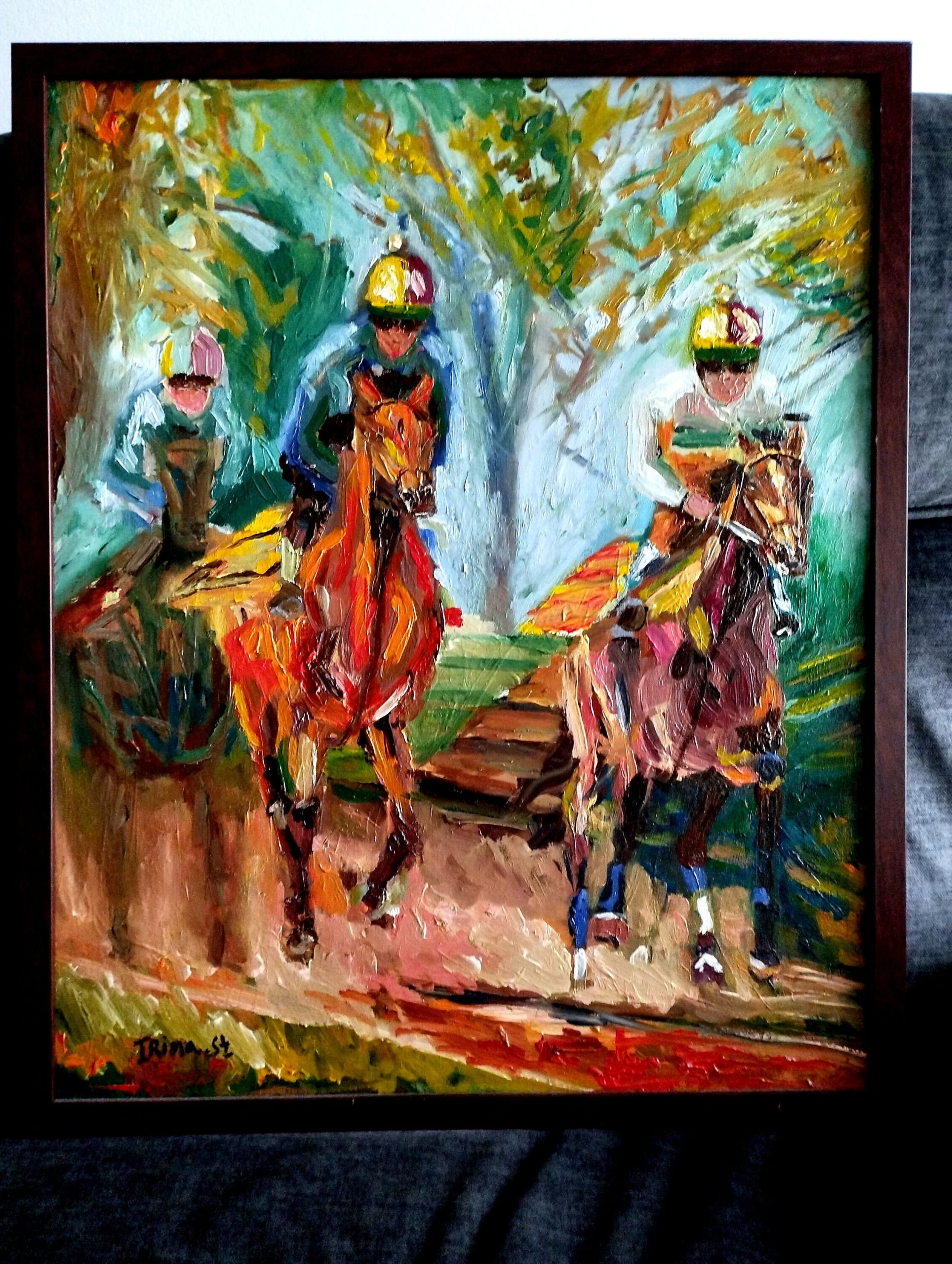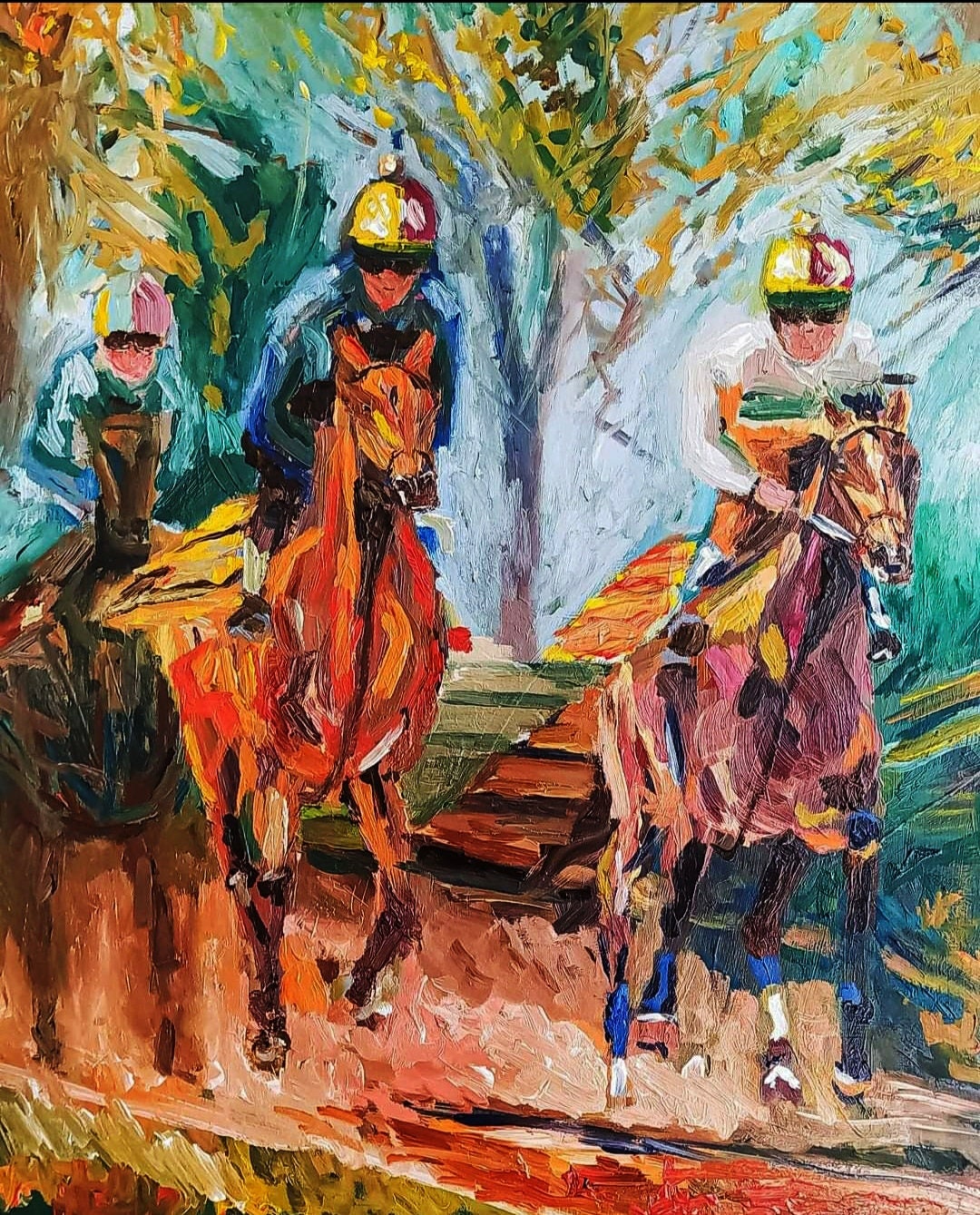 ציור שמן על עץ – שלושה רוכבים על סוסים, סגנון אימפרסיוניסטי