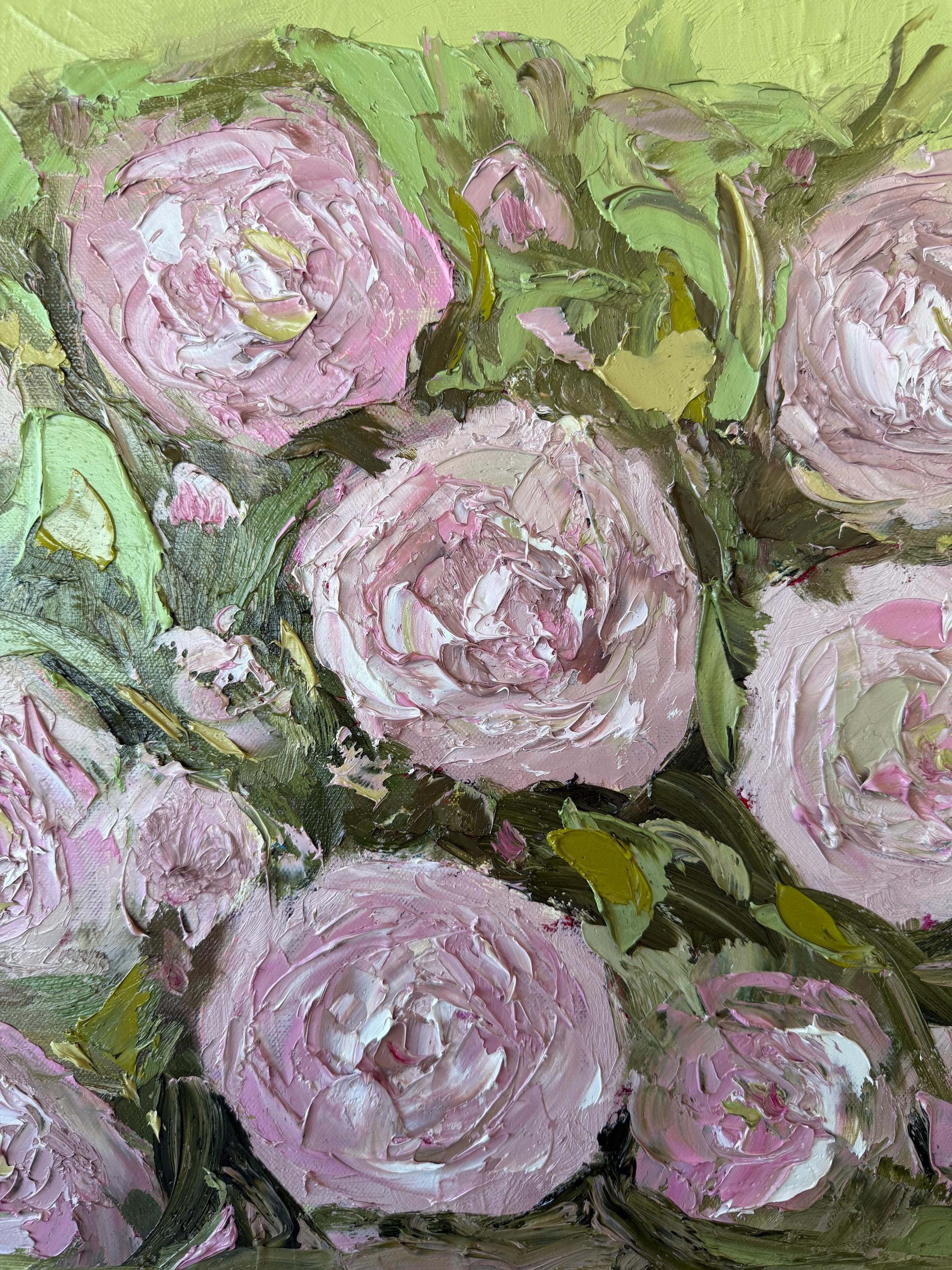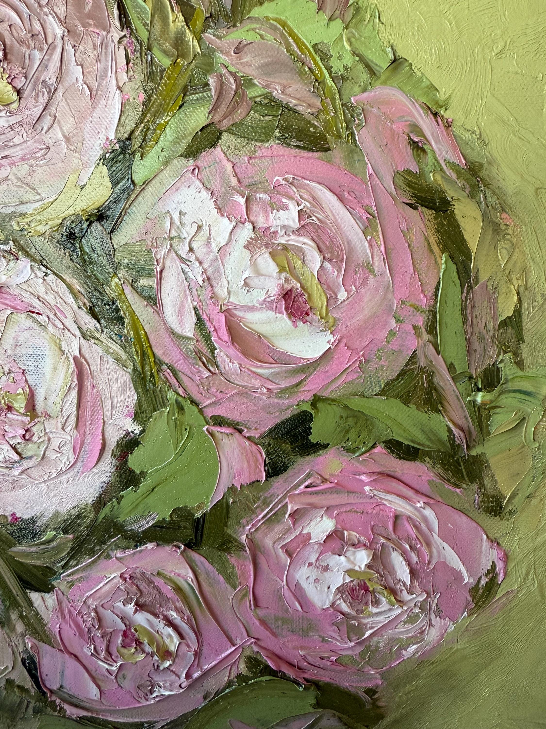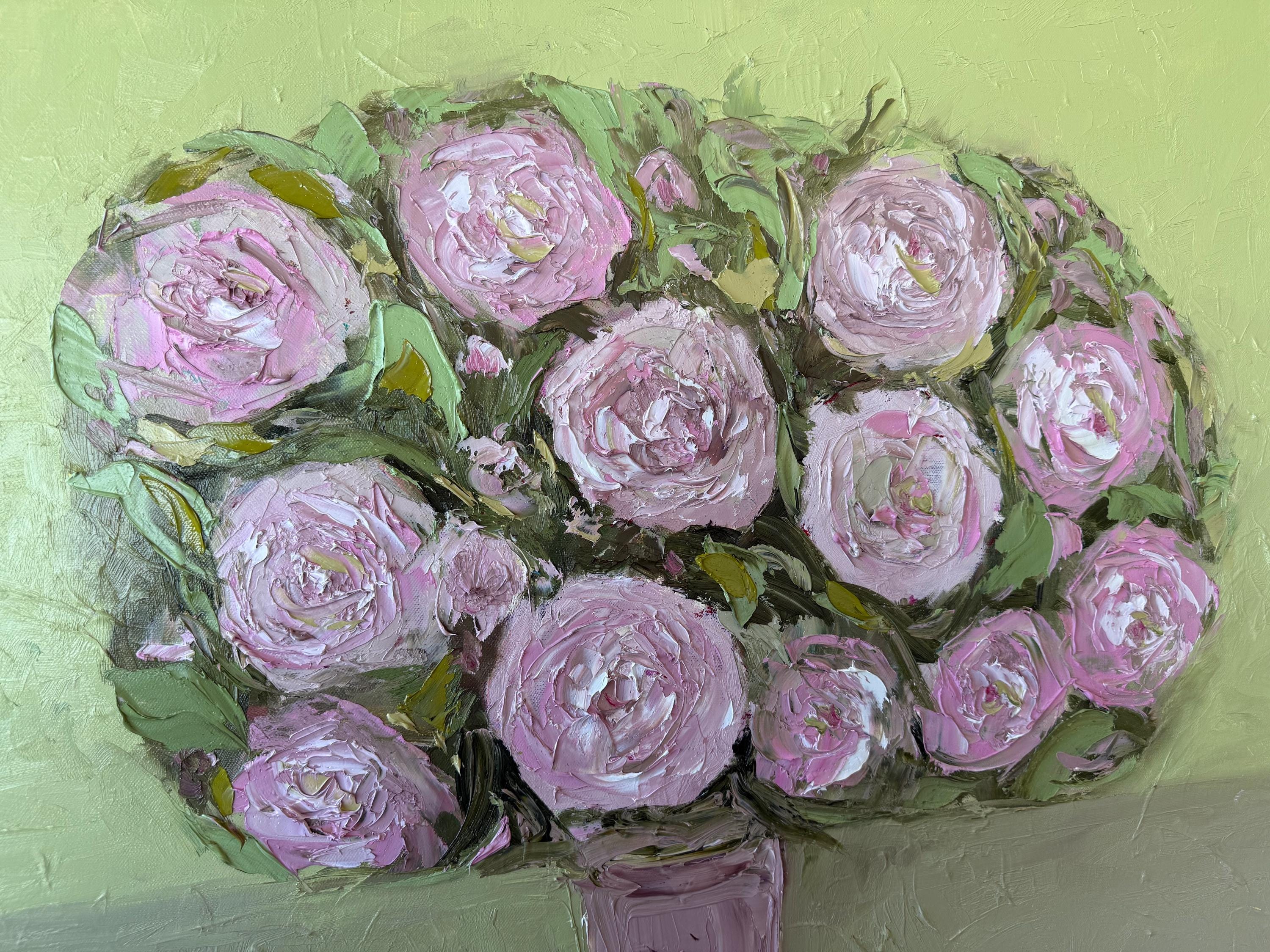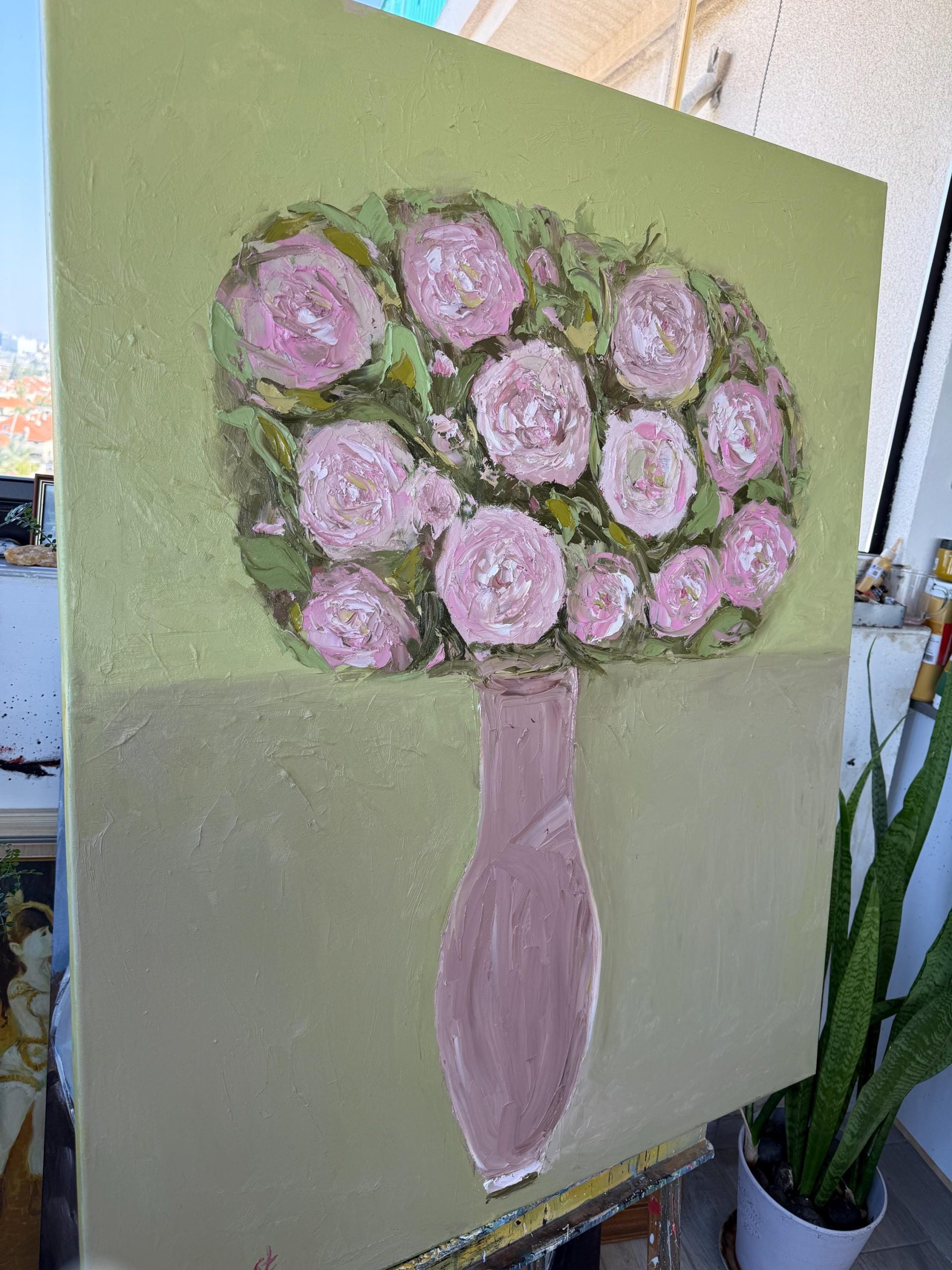 ציור מקורי – אגרטל ורוד עם ורדים בצבעי שמן על בד קנבס איטלקי