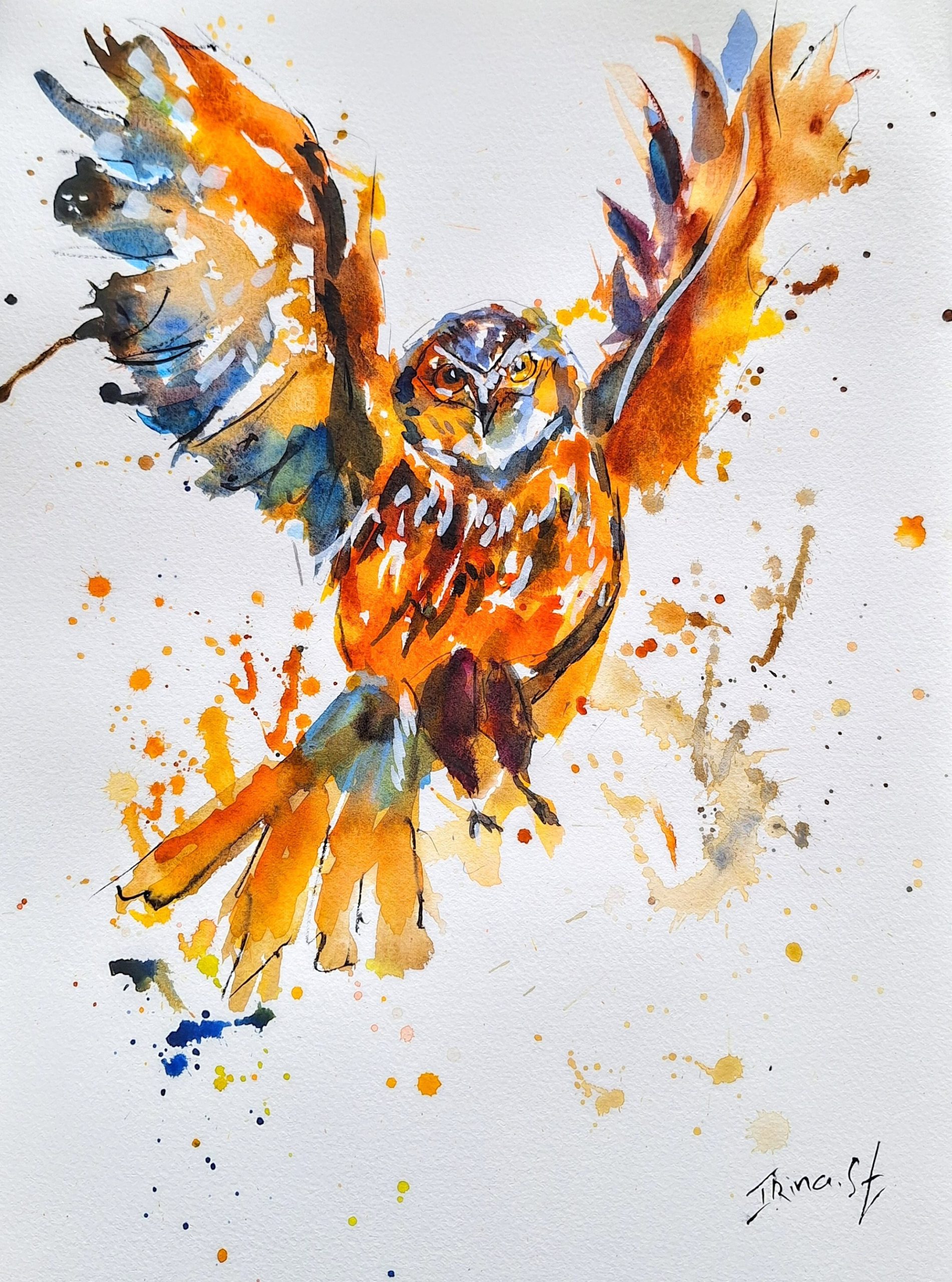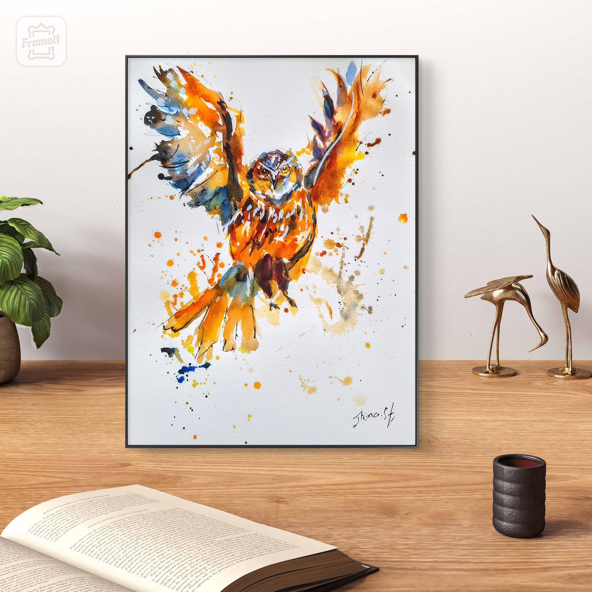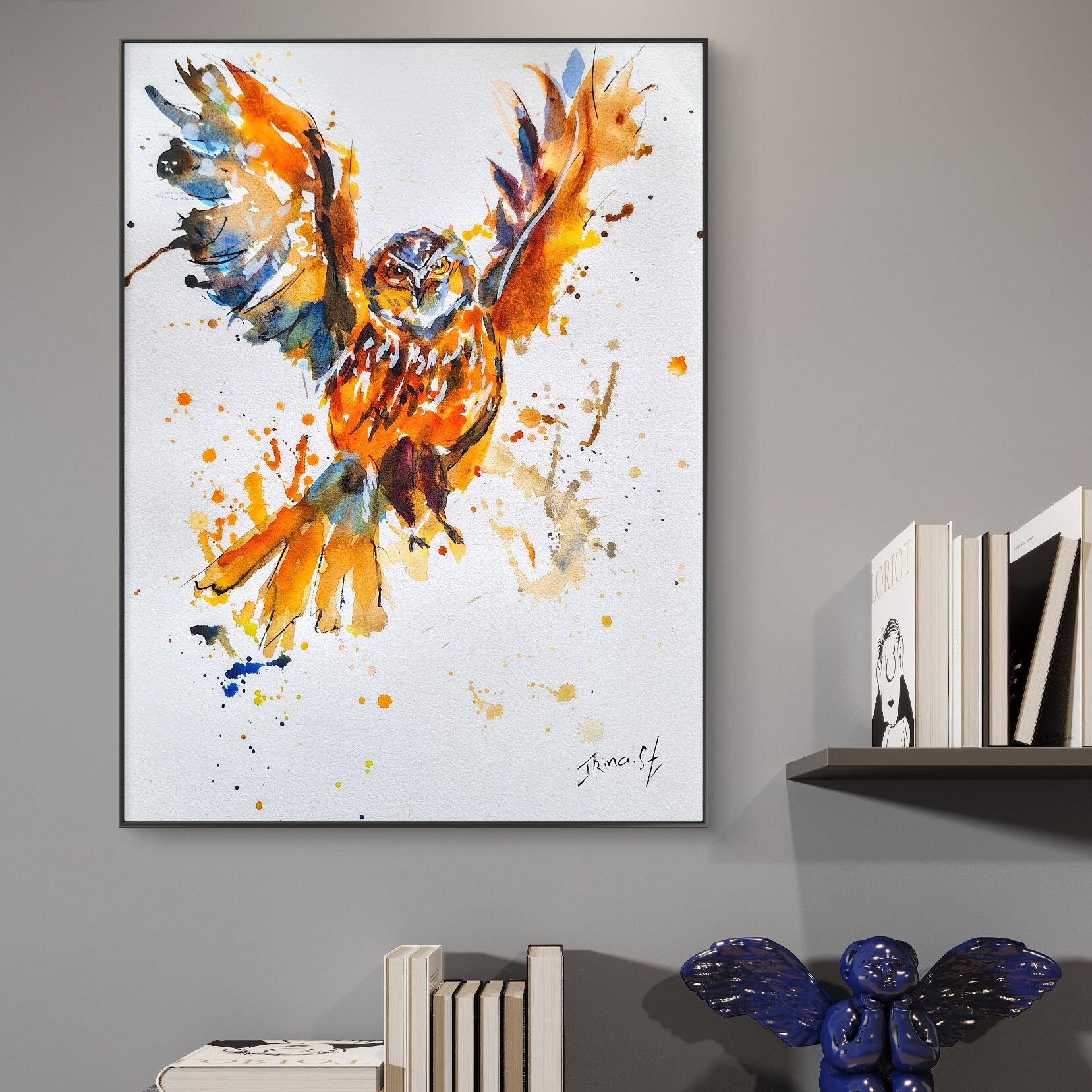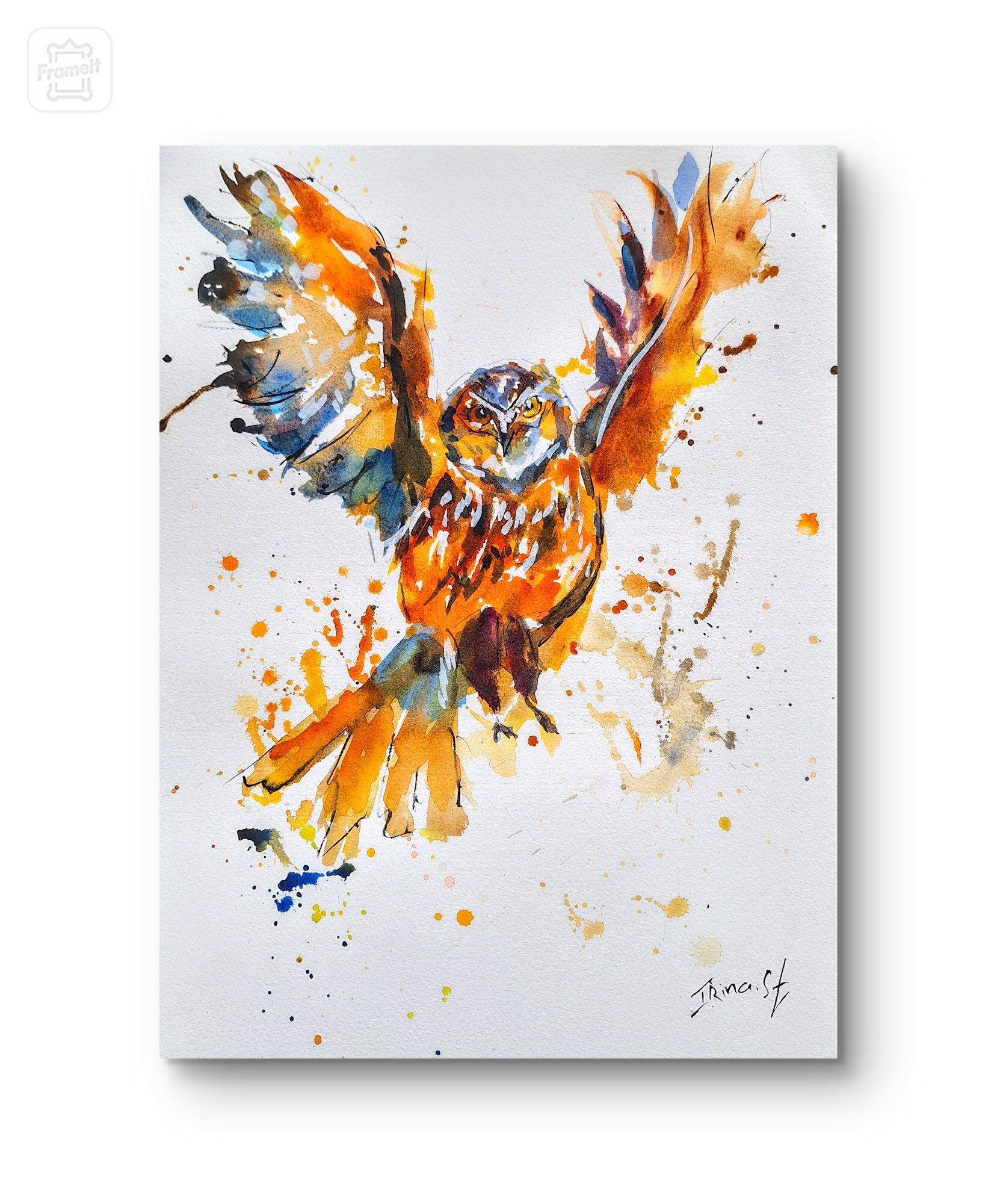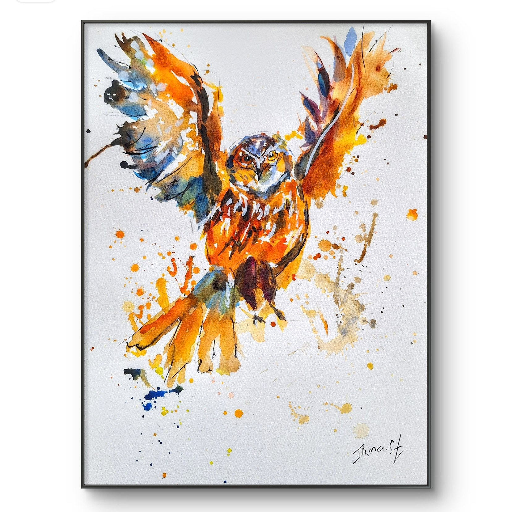 Handmade Watercolor Owl Painting: Colorful Illustration on Cotton Paper
