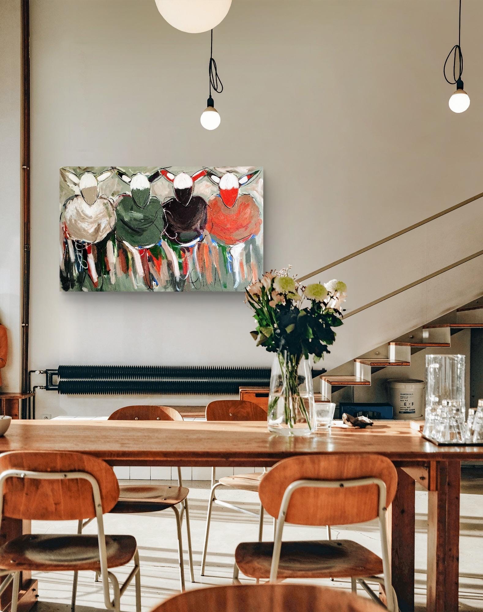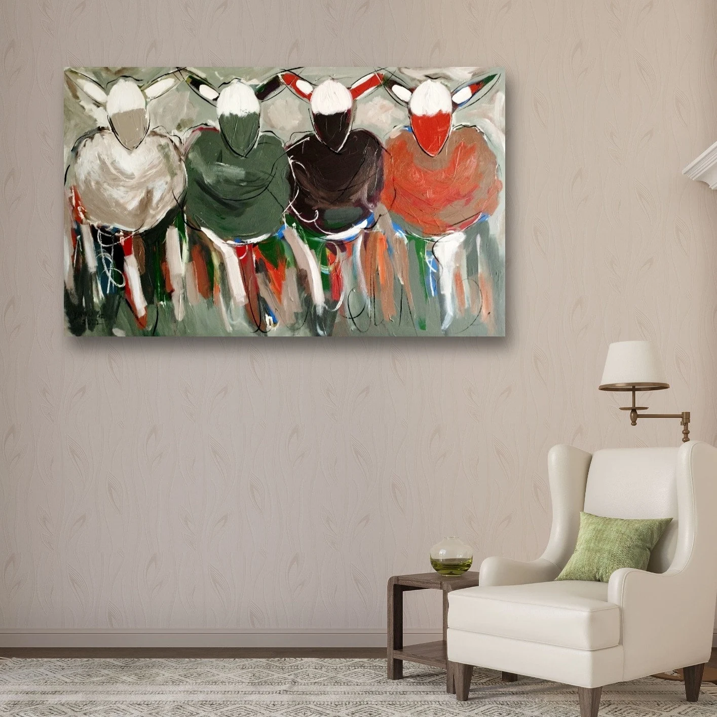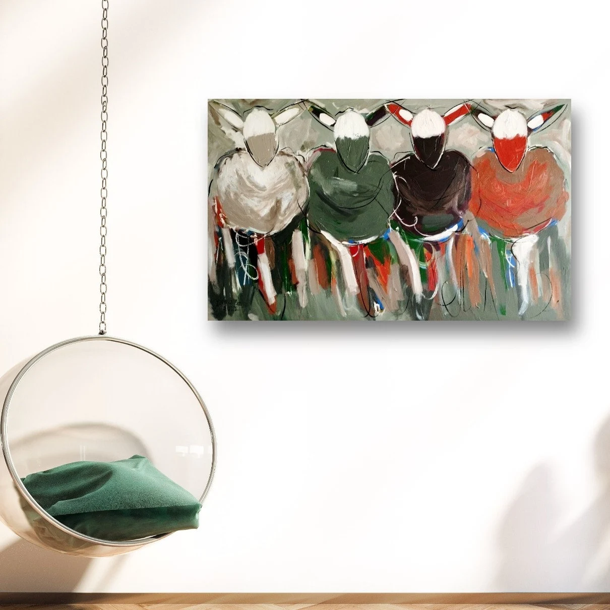 הציור משלב בין חום הכבשים לבין קווים וצבעוניות מודרנית, ומעניק תחושת רוגע ואסתטיקה עכשווית לכל חלל. בזכות טכניקת השמן העשירה מתקבל עומק צבע מרשים וטקסטורה חיה, ההופכים את היצירה למוקד עניין אמנותי בכל חדר.