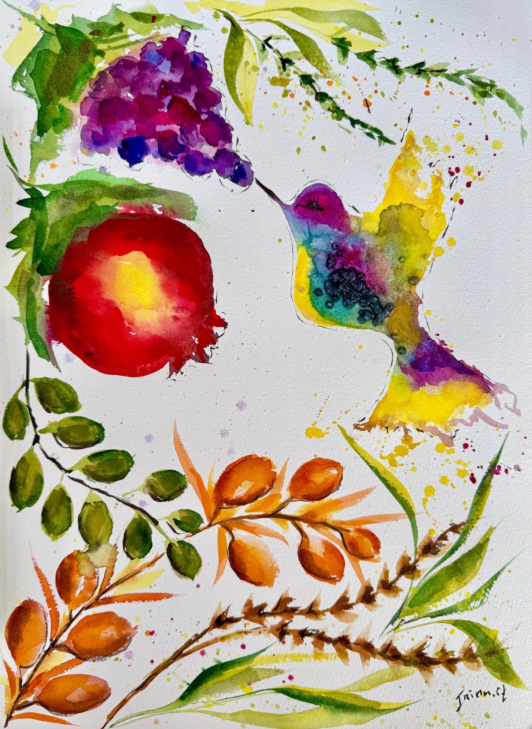 ציור בוטני מקסים וייחודי, עשיר בפרטים ובמשמעות עמוקה. יצירה זו מכילה את סמלי השפע של ארץ ישראל – שבעת המינים – יחד עם דמותו העדינה של יונק הדבש, ומתאימה במיוחד כמתנת ברכה או כפריט עיצוב לבית עם אמירה.