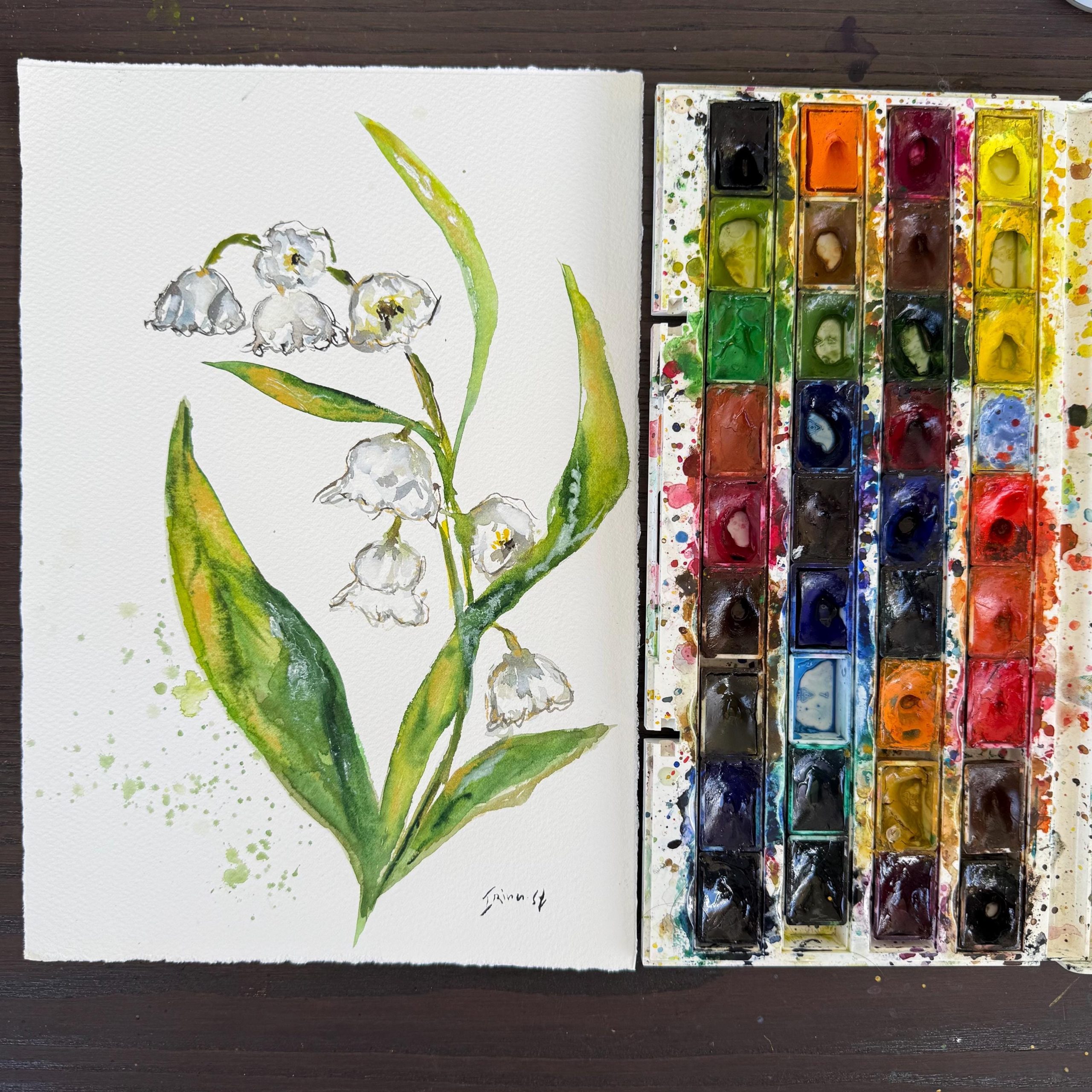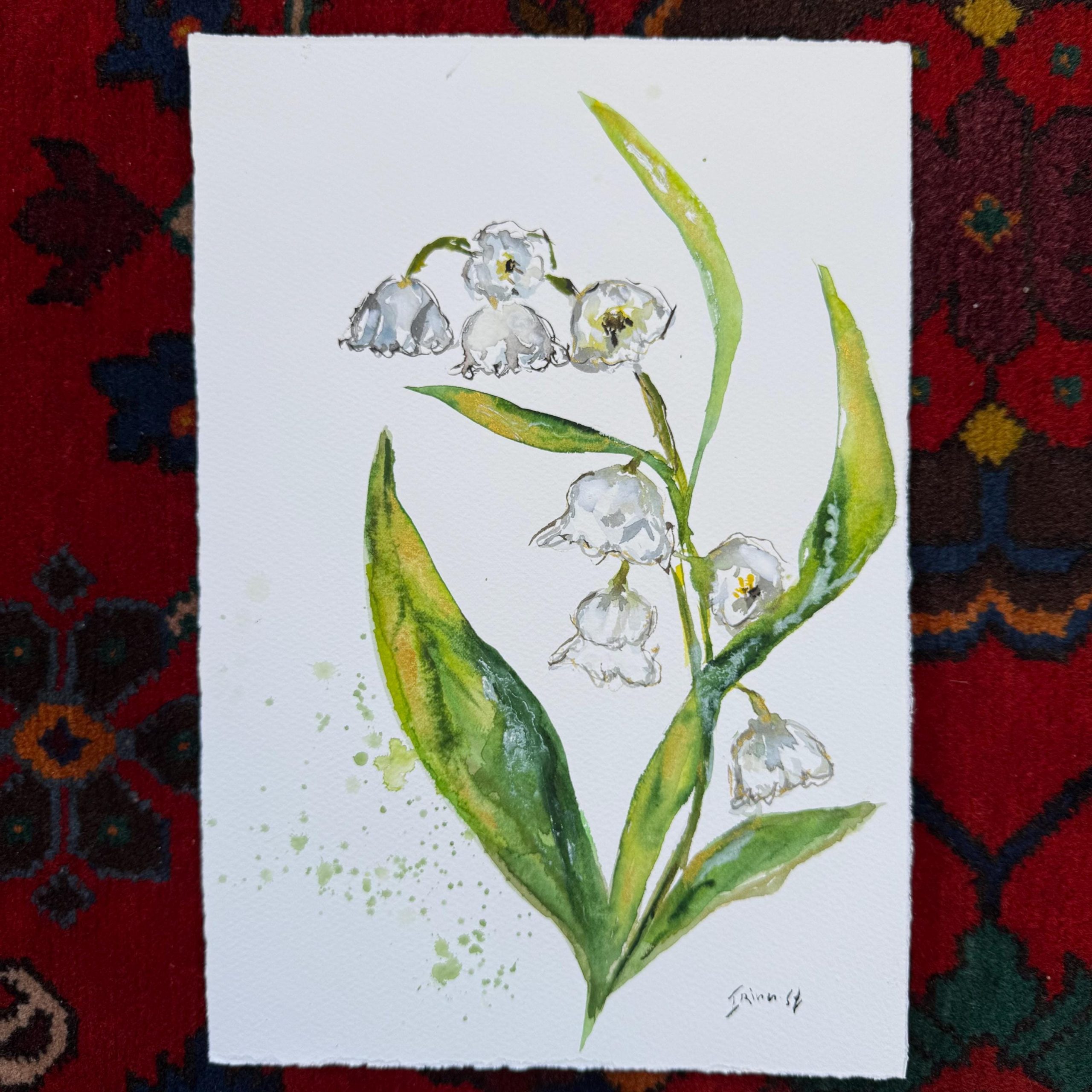 ציור מקורי בצבעי מים של שושנת העמקים פרחים עדינים בסגנון מופשט, יצירה מלאת רוך ותנועה טבעית, בעבודת יד מאת האמנית אירינה סופיצ'ייב.
