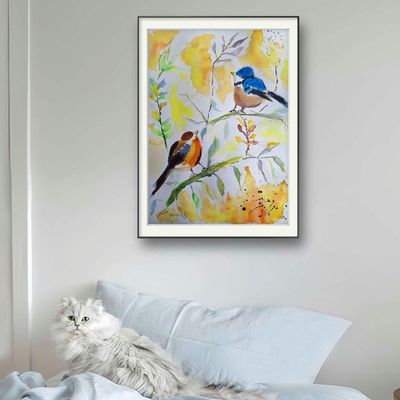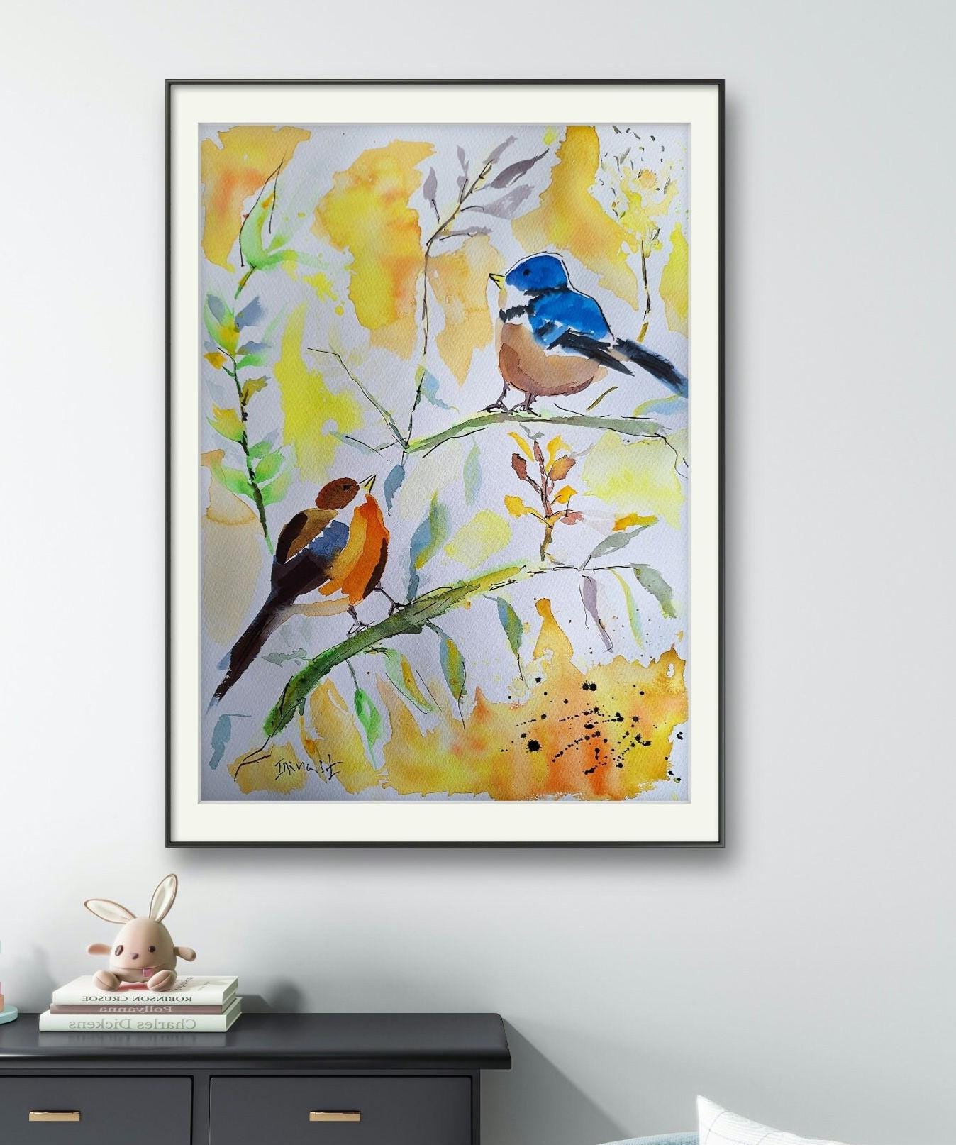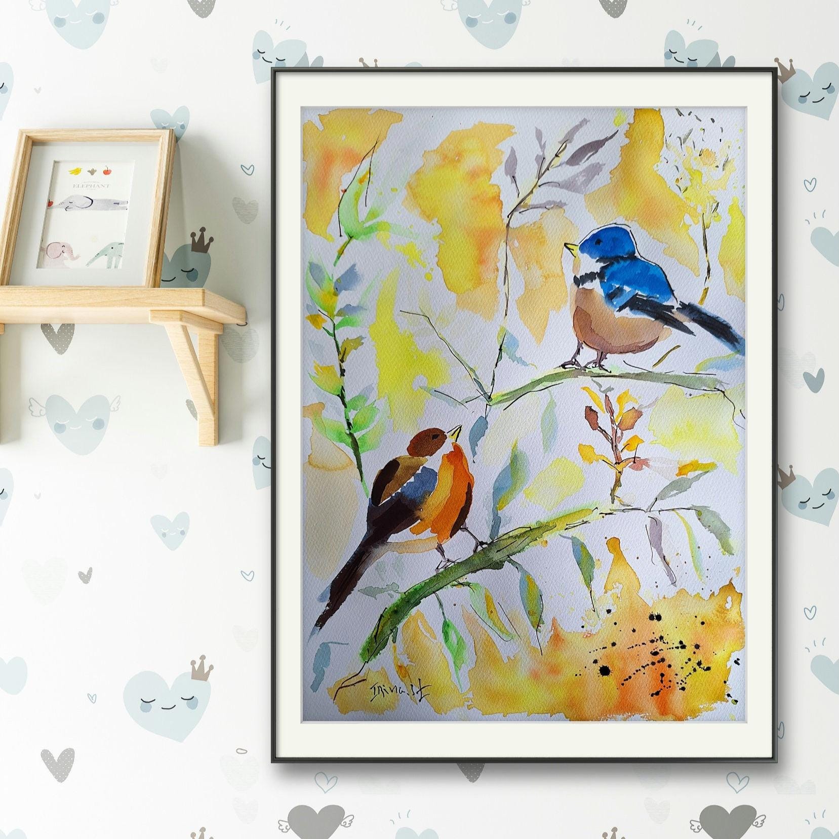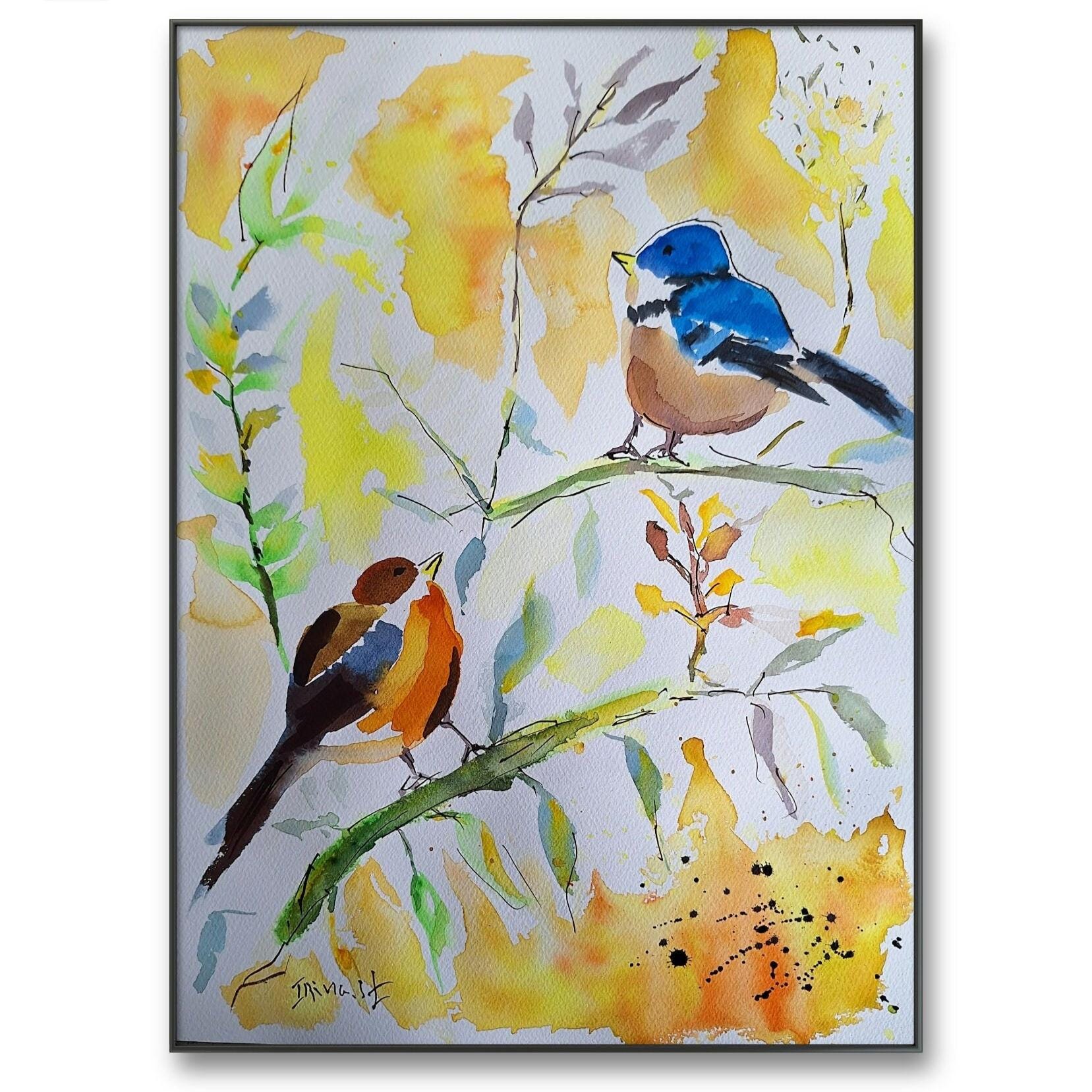 Original Bird Watercolor Painting: Colorful Bird Art on Cotton