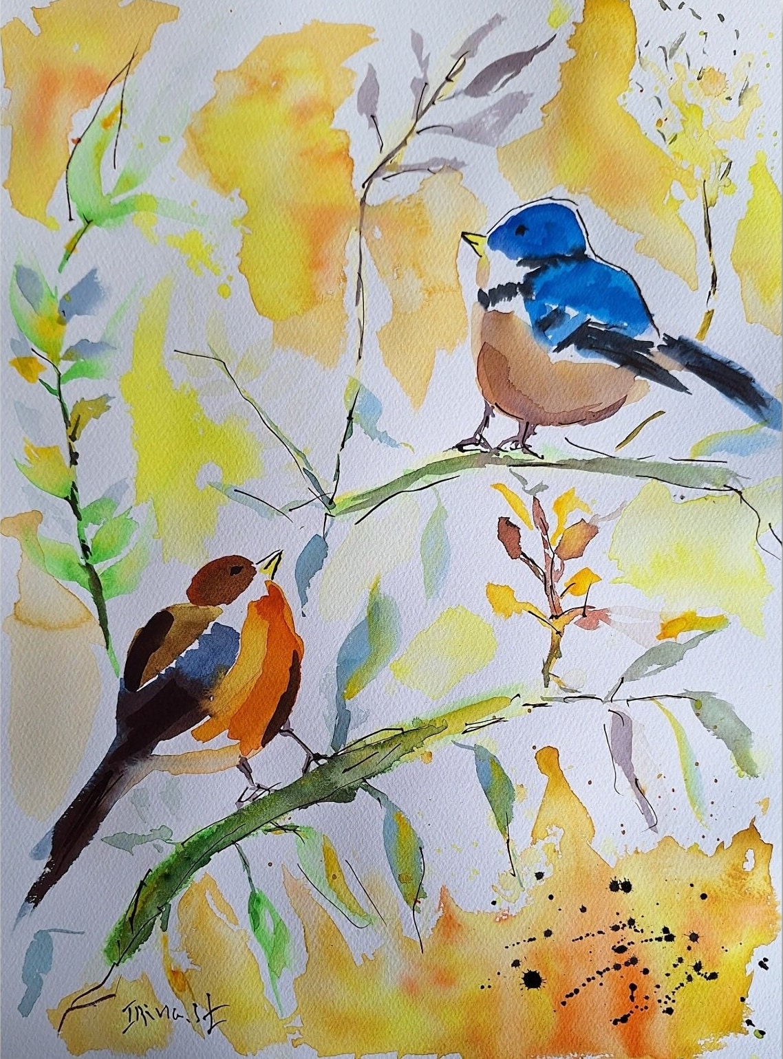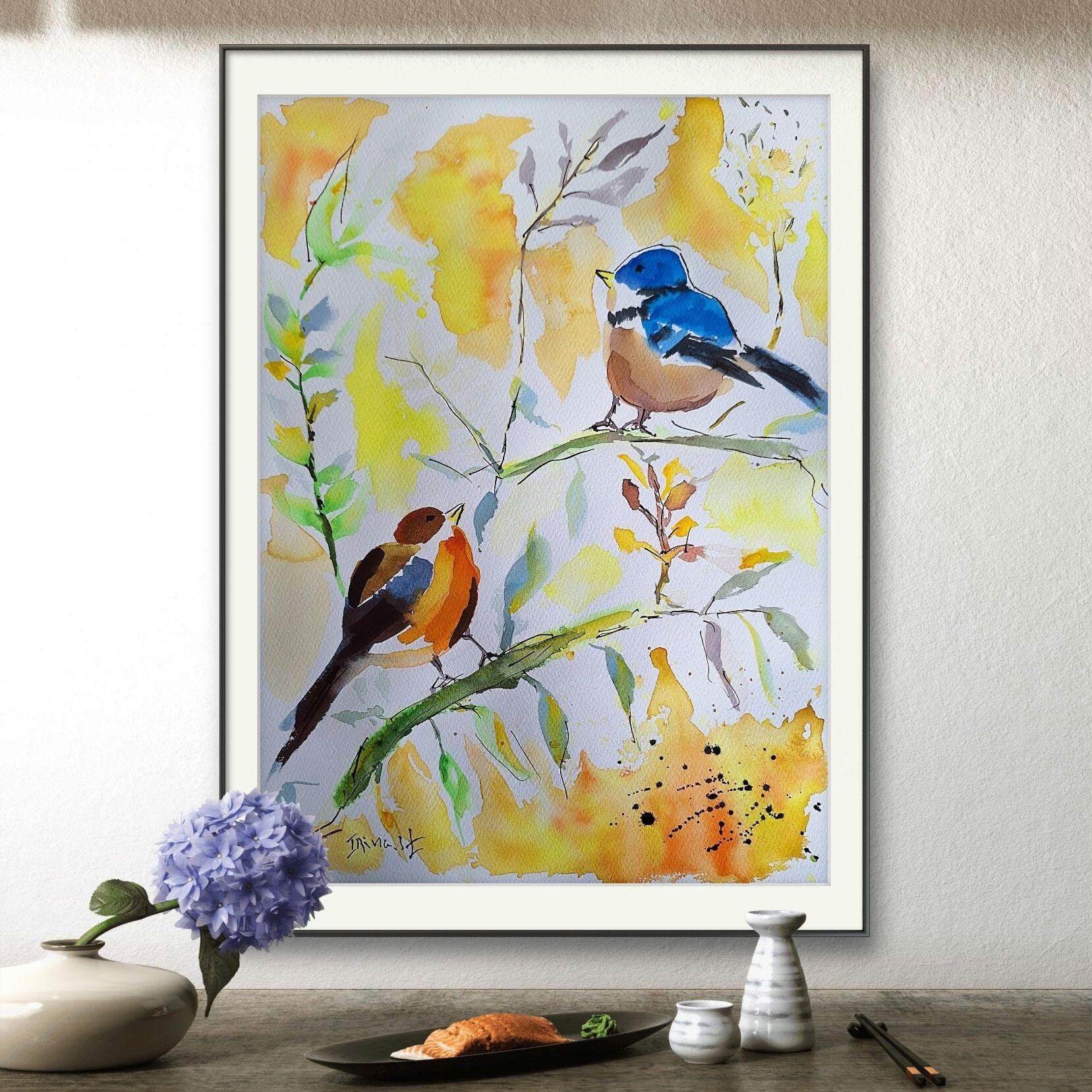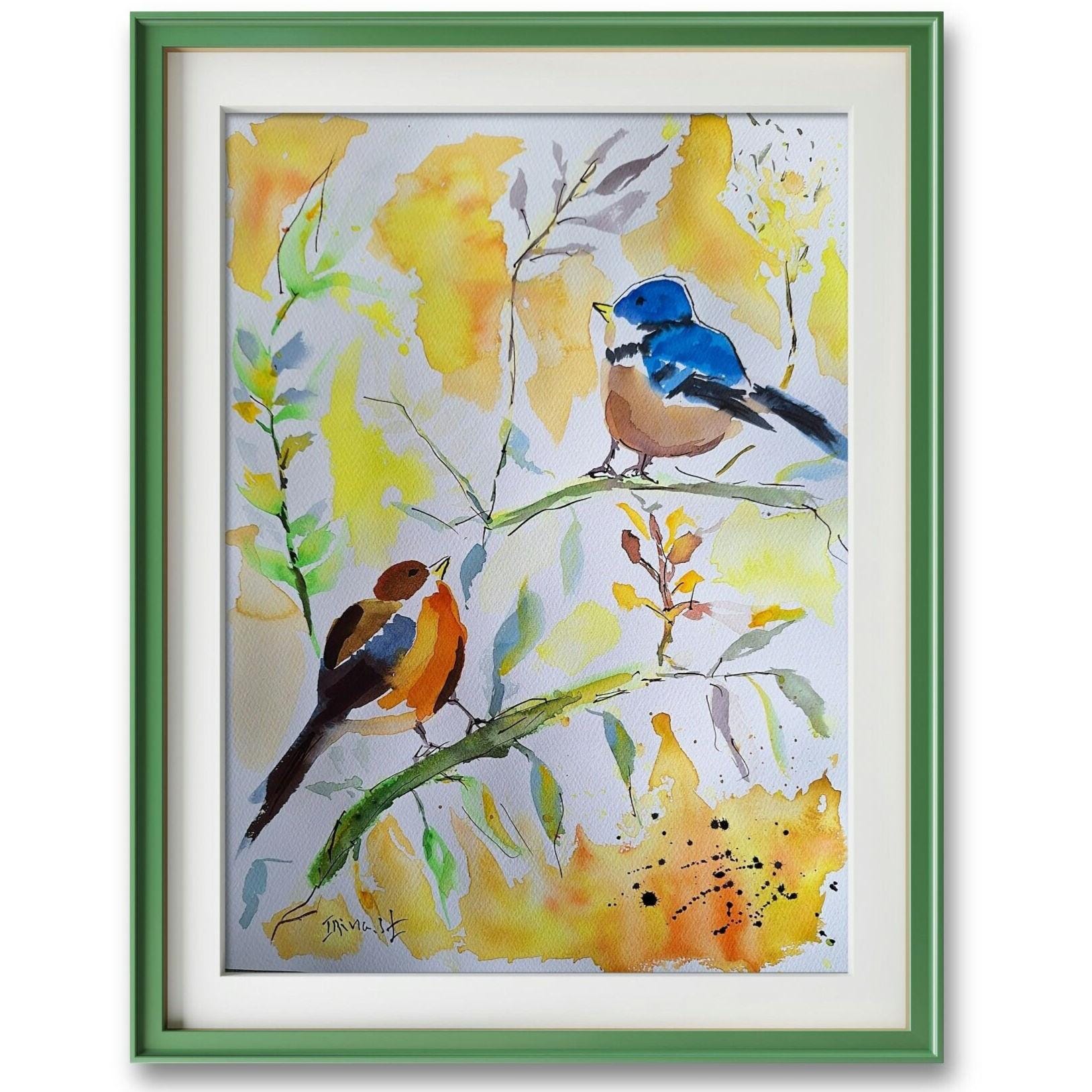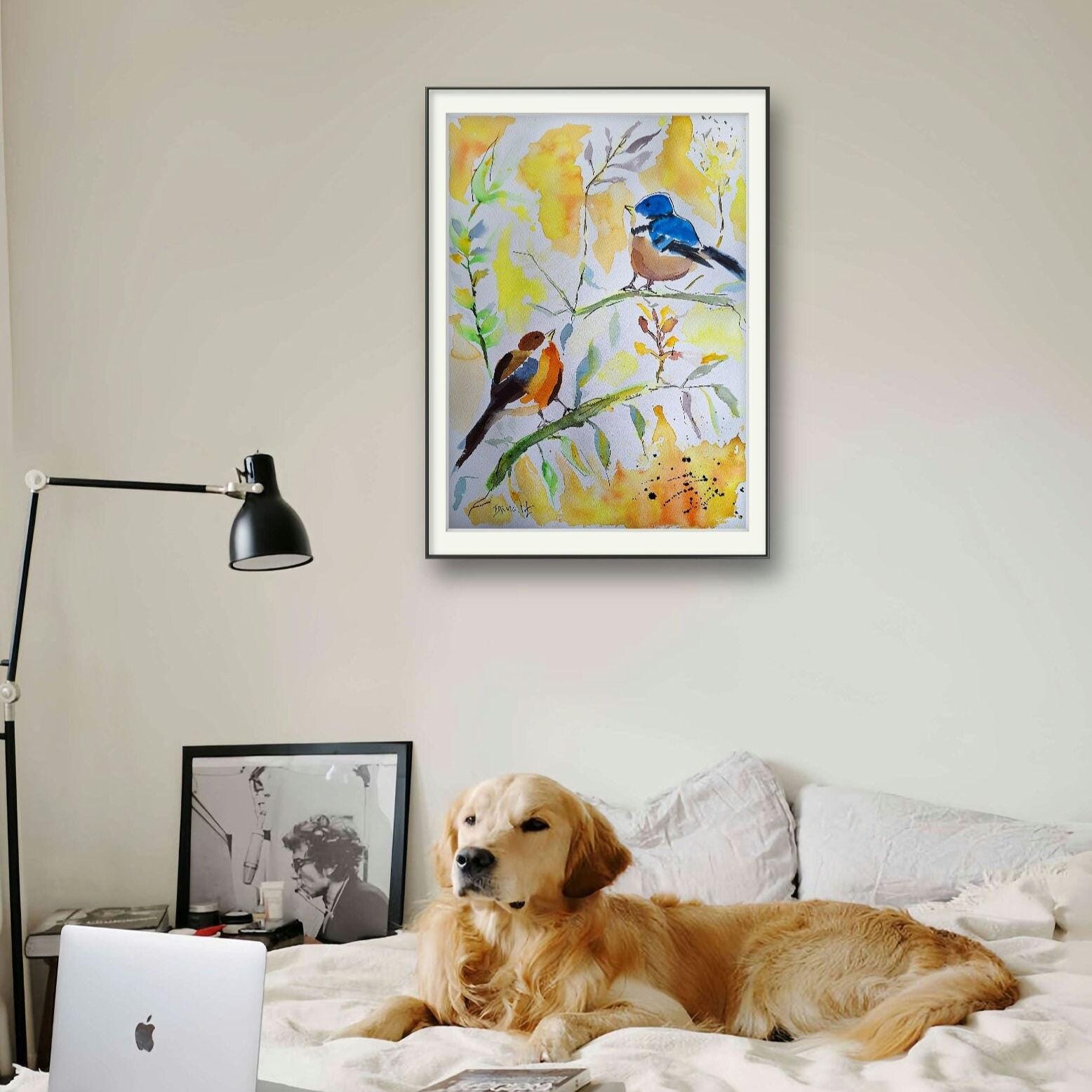 Original Bird Watercolor Painting: Colorful Bird Art on Cotton