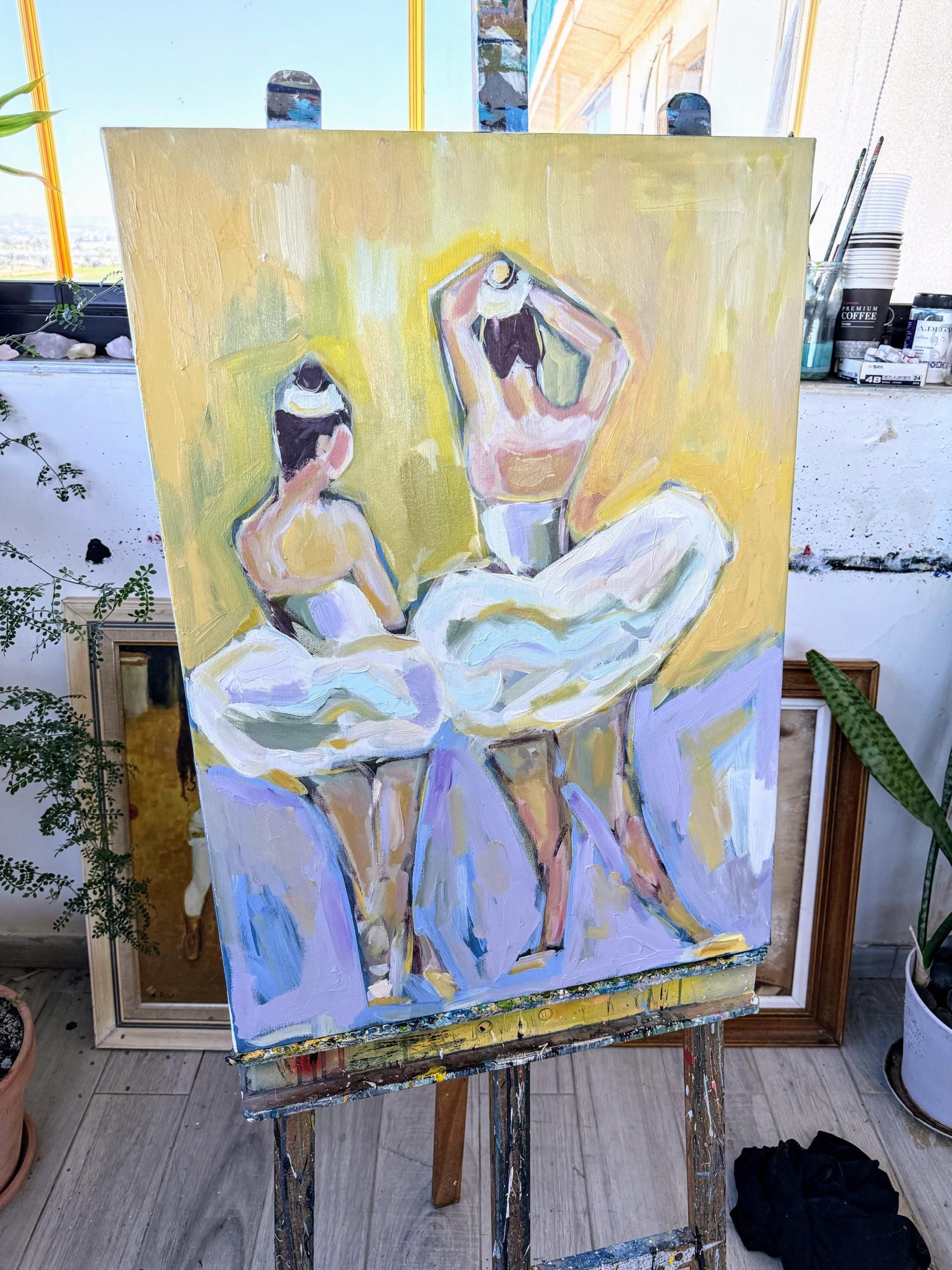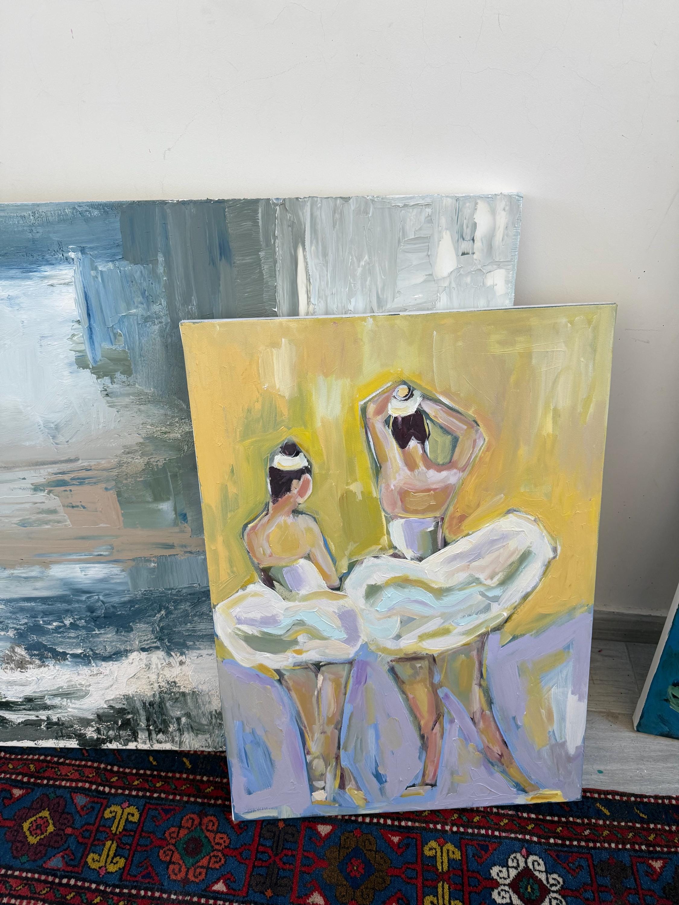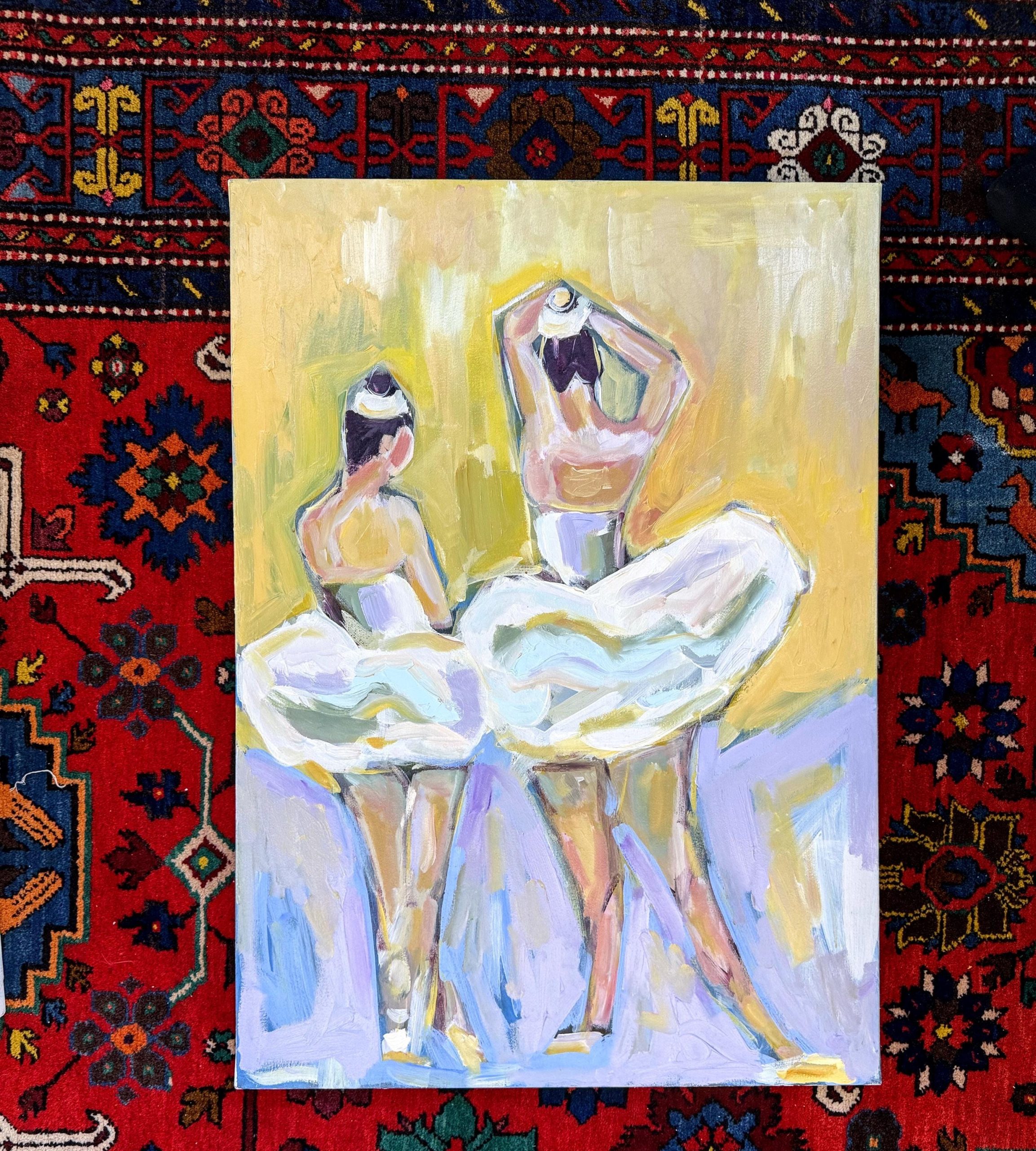 ציור שמן מקורי – שתי רקדניות בלט בטוטו לבן