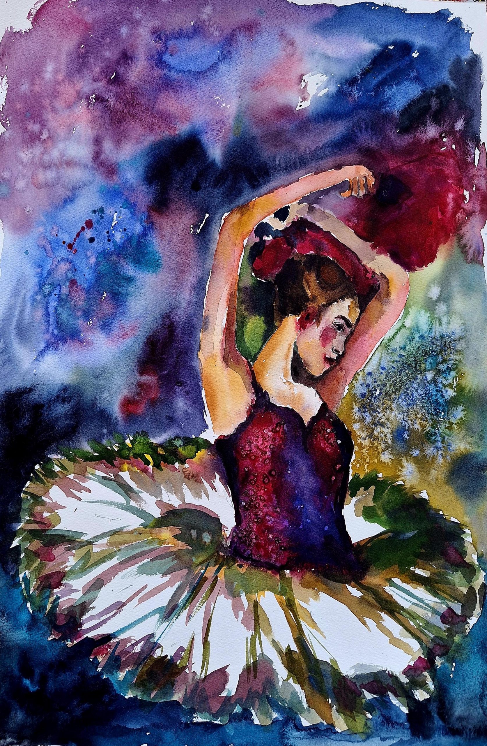 This is an original, hand-painted watercolor artwork of a ballerina, captured mid-movement in vivid, expressive colors. The deep reds and purples convey elegance and passion, while the fluid background brings a dreamlike quality.
