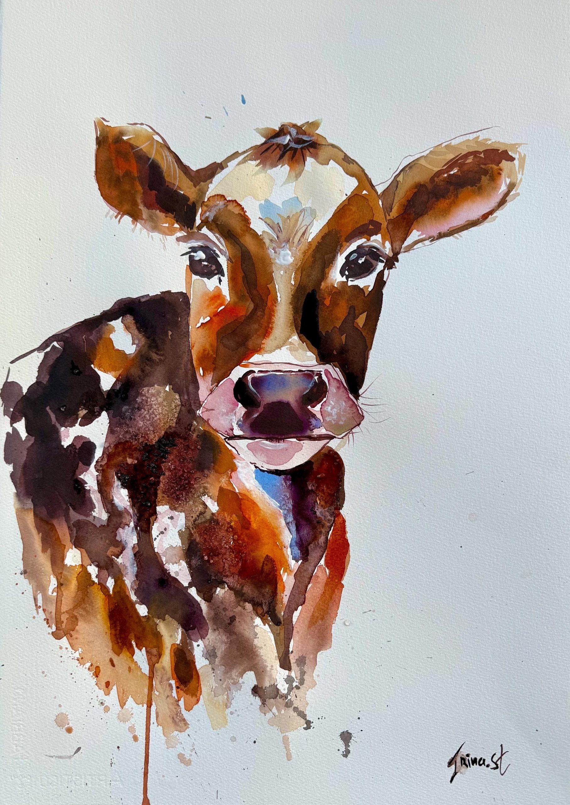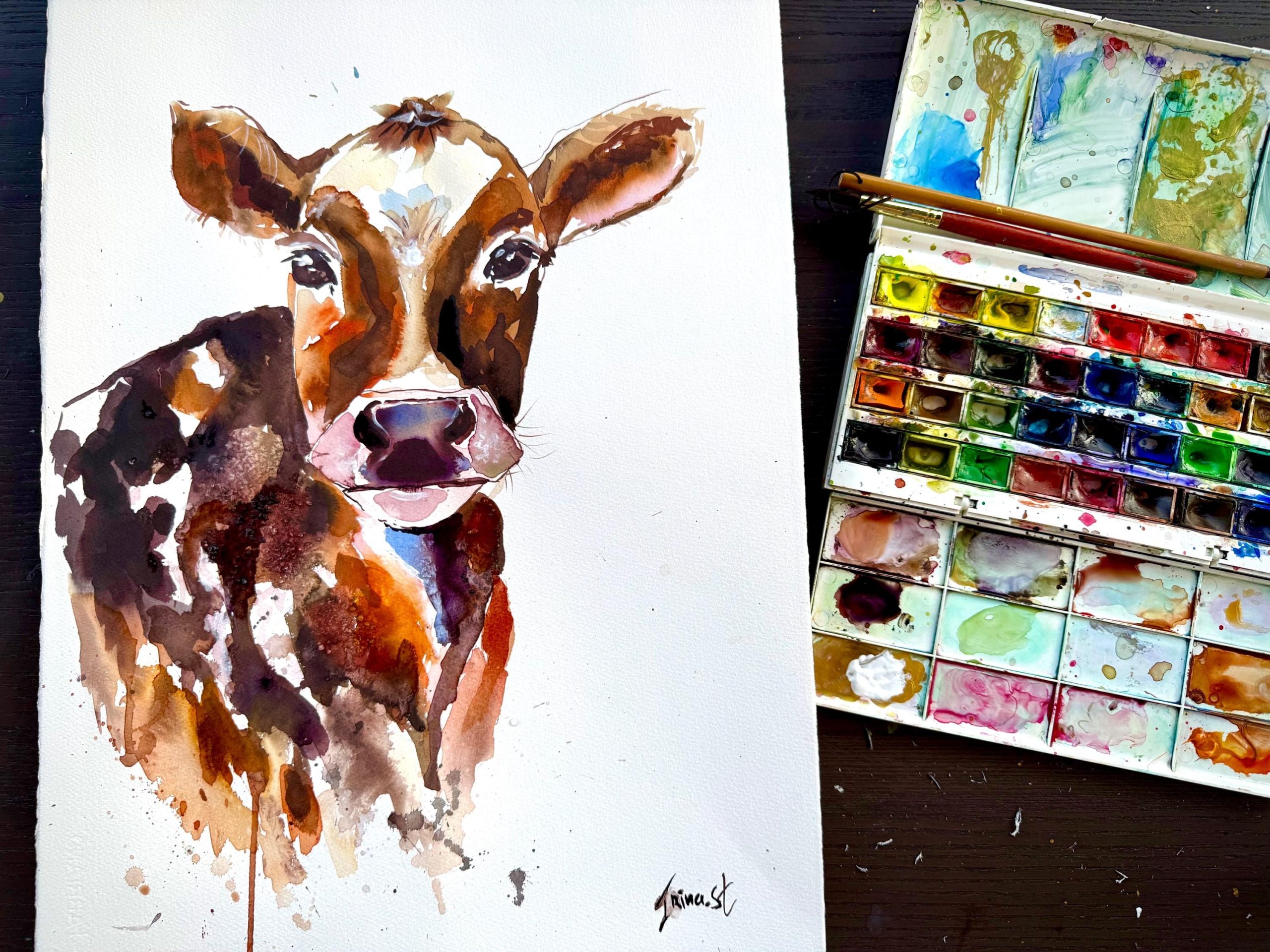 This is an original watercolor painting of a cow, hand-painted on 100% cotton watercolor paper.