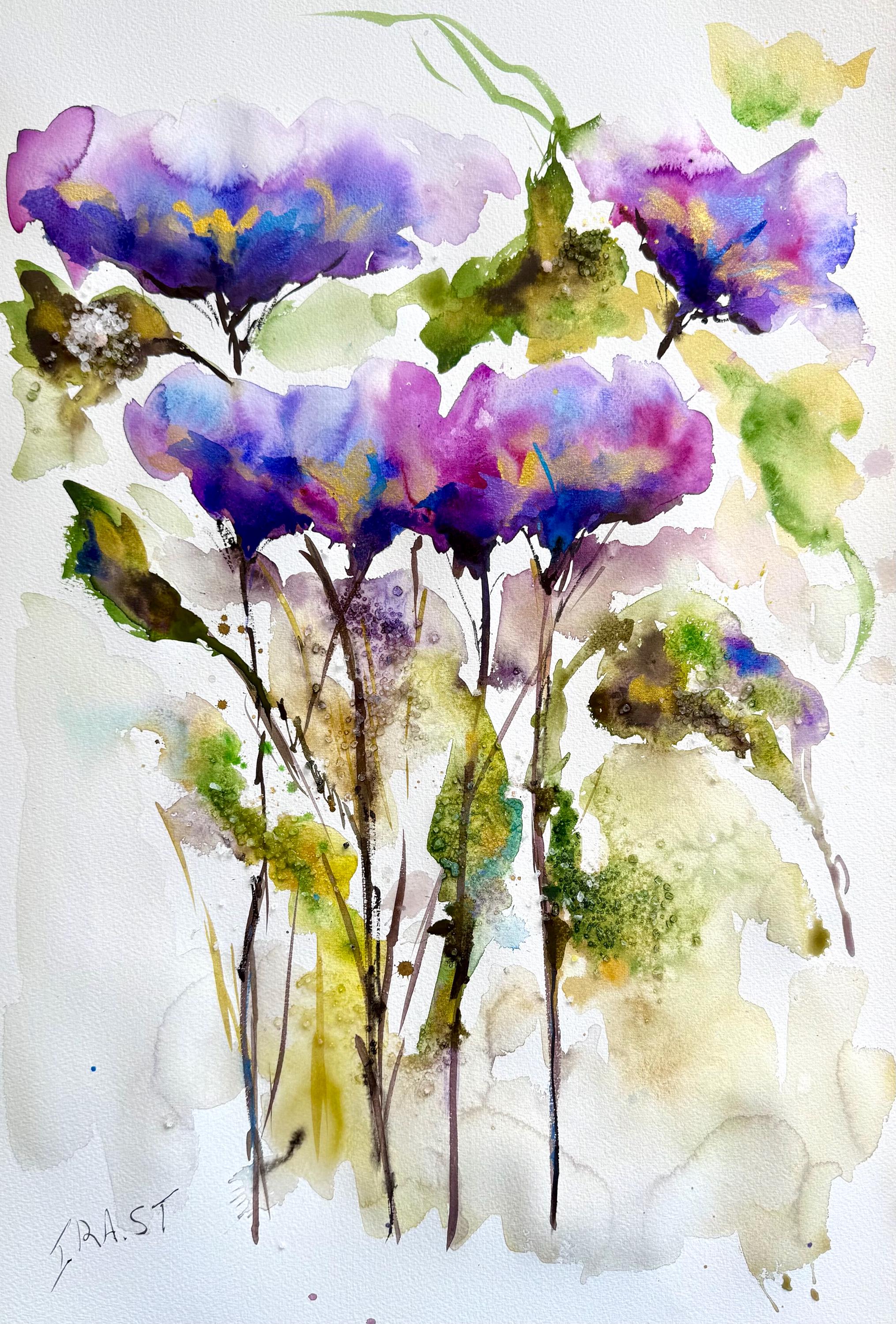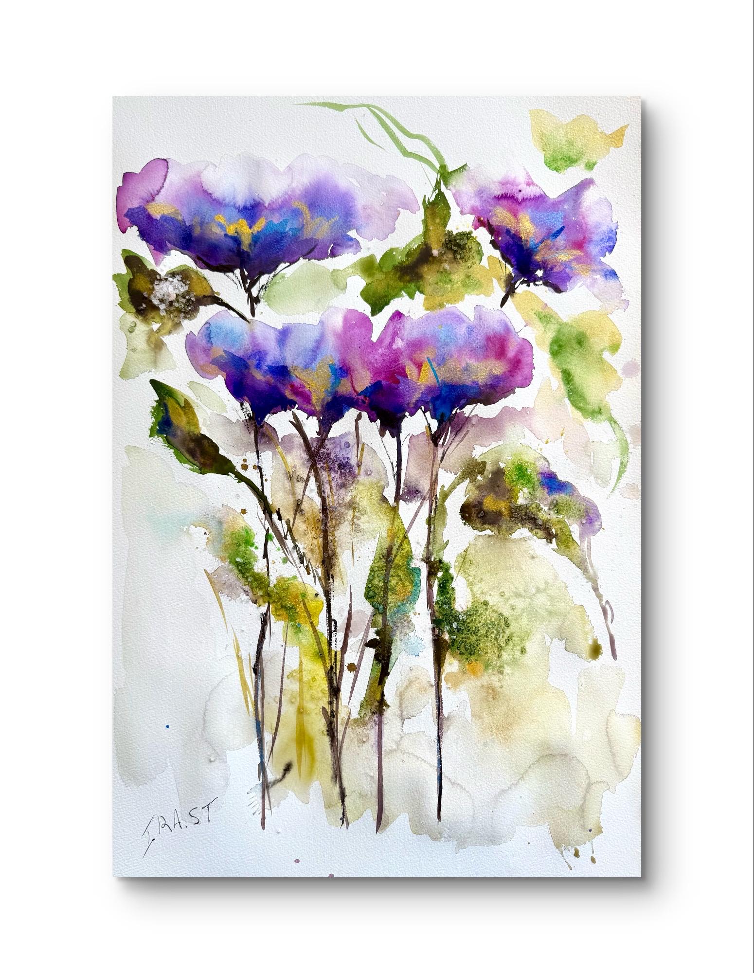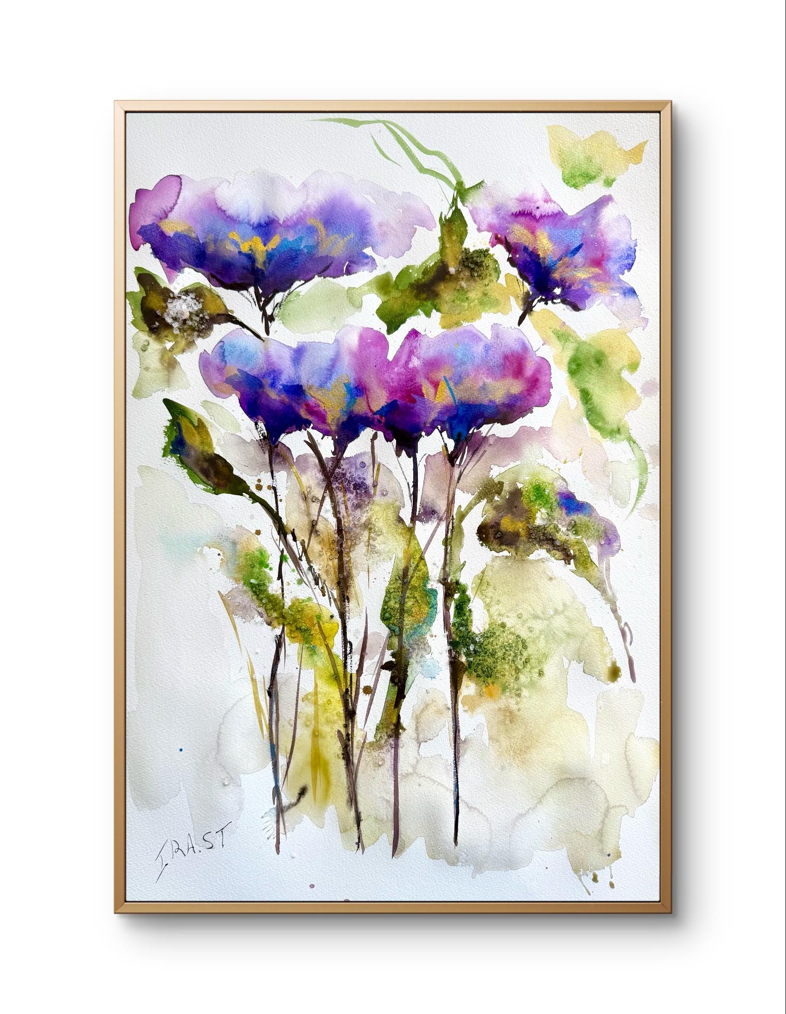 Original Watercolor Painting Purple Blue Floral Wall Art Large Botanical Artwork 22×15.7 in