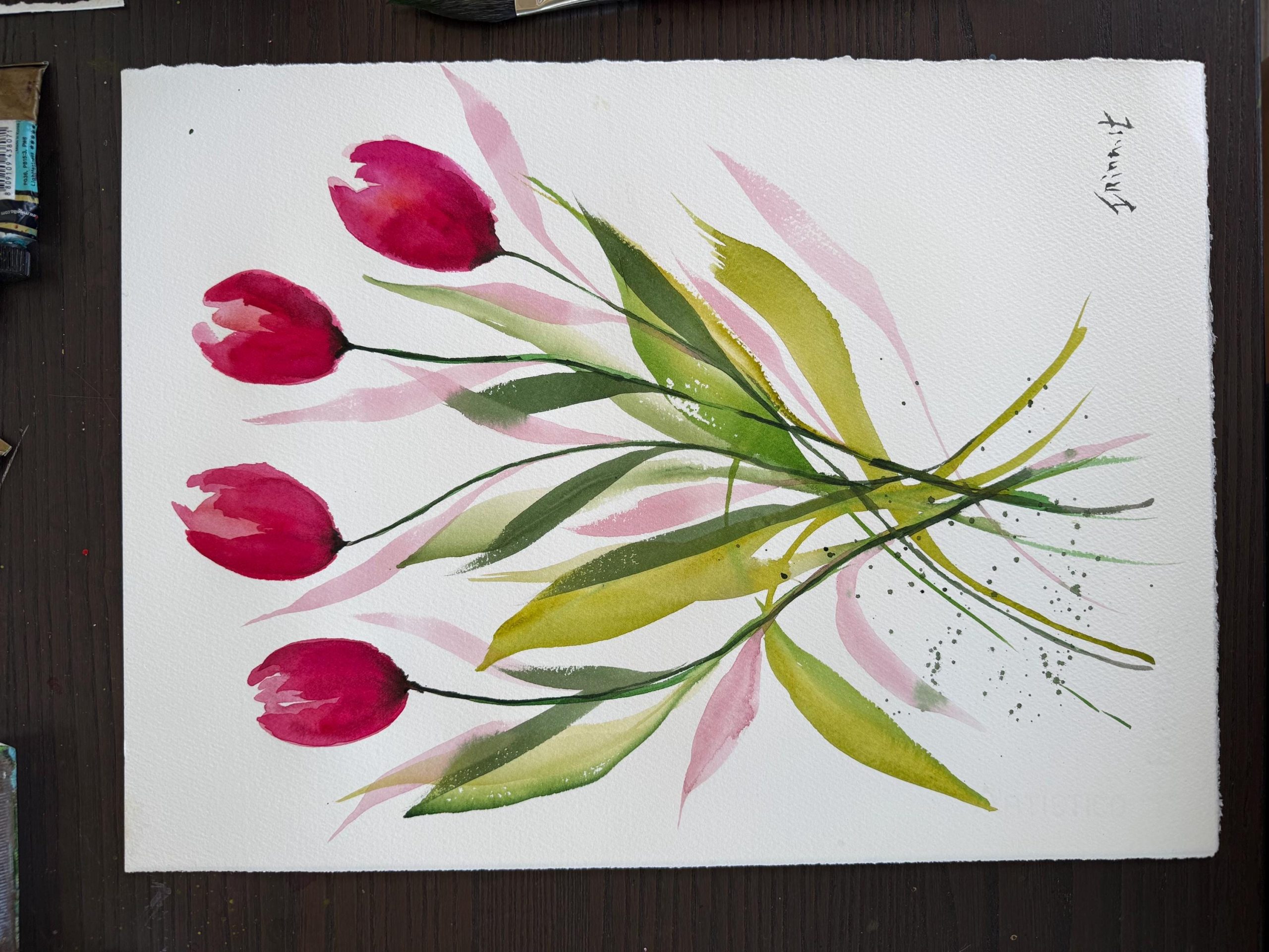 ציור טוליפים בורוד עז צבעי מים מקוריים