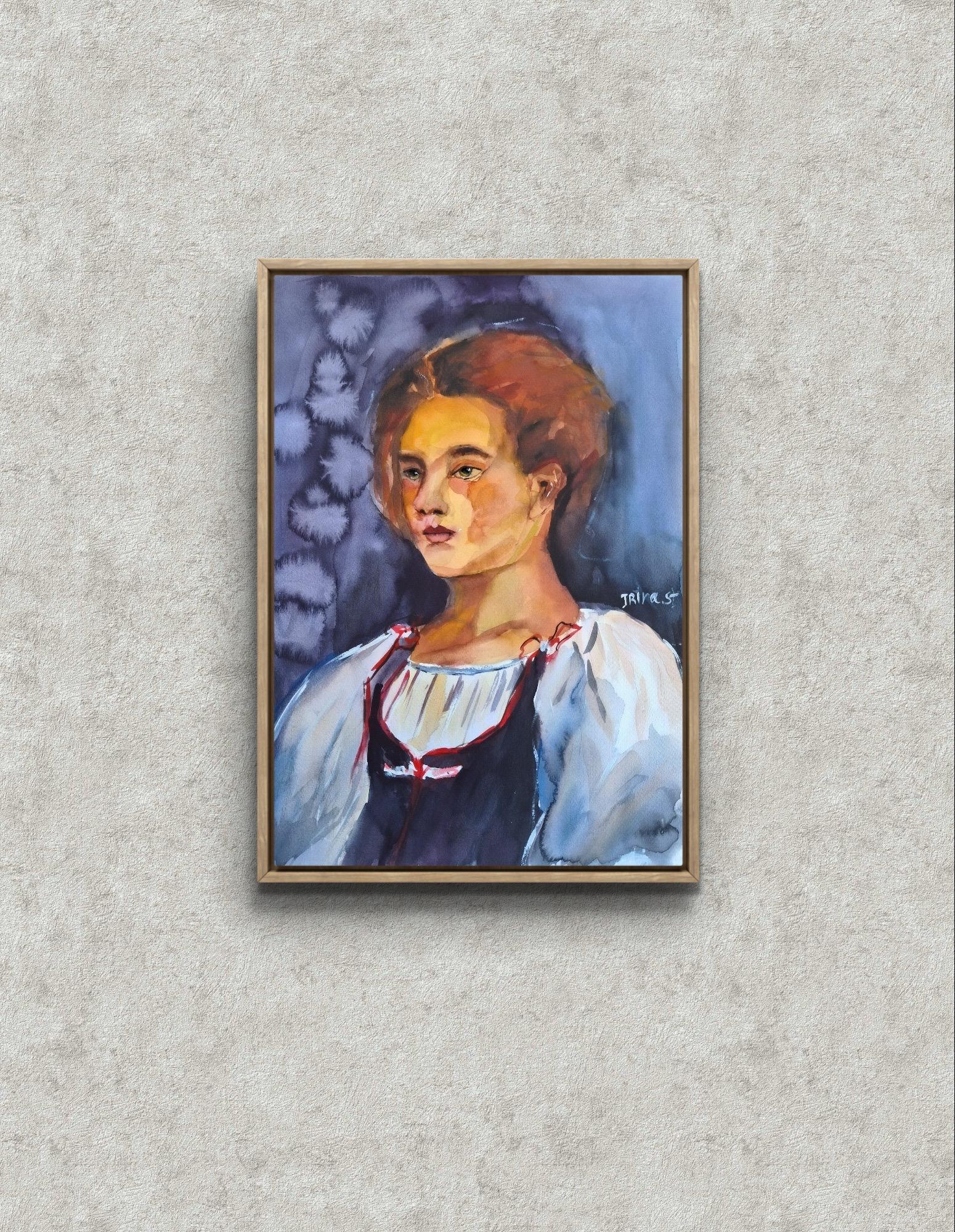 Red-Haired Woman Watercolor Painting: Handcrafted Portrait on Cotton Paper
