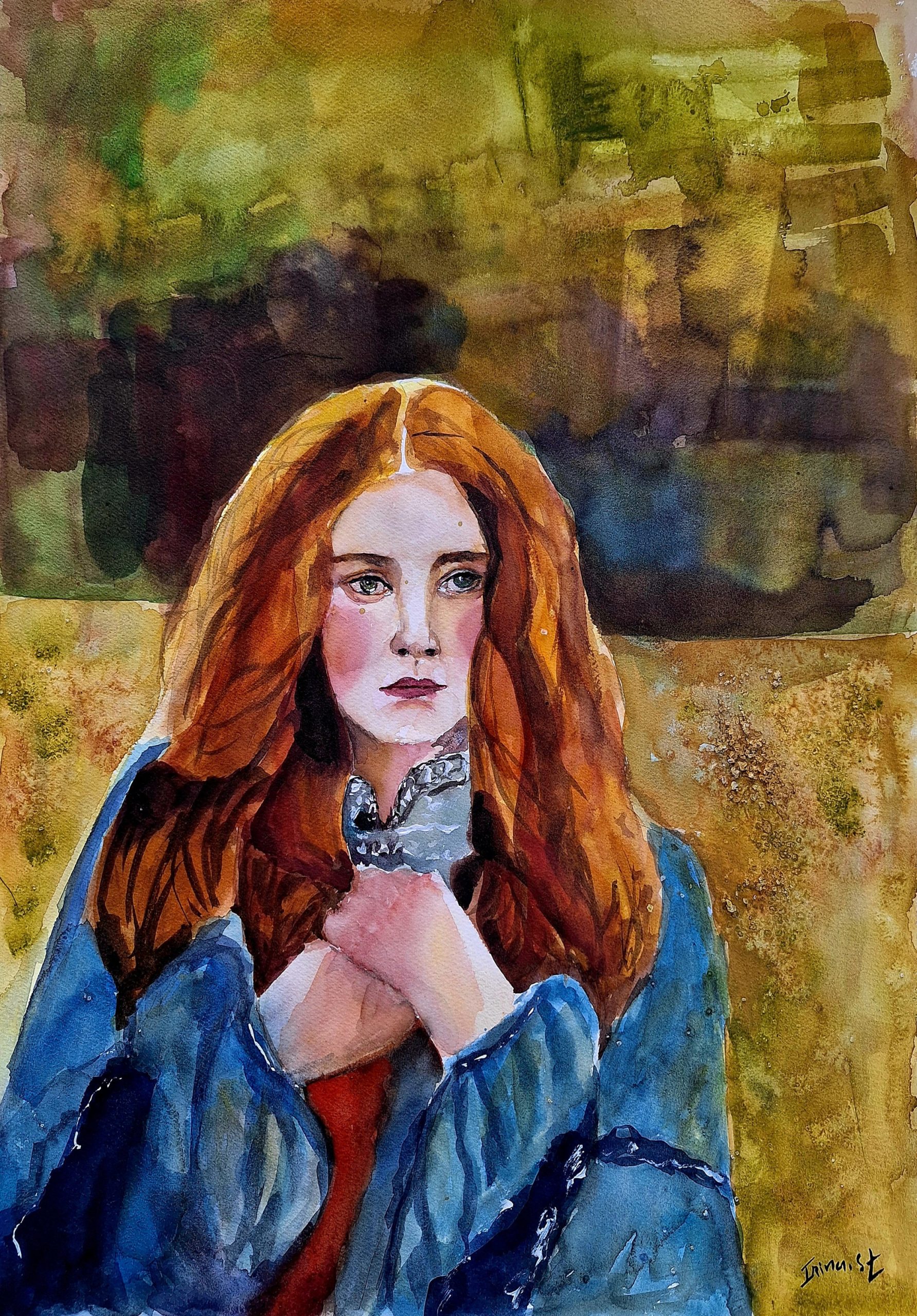 Red-Haired Woman Watercolor Painting: Handcrafted Portrait on Cotton Paper