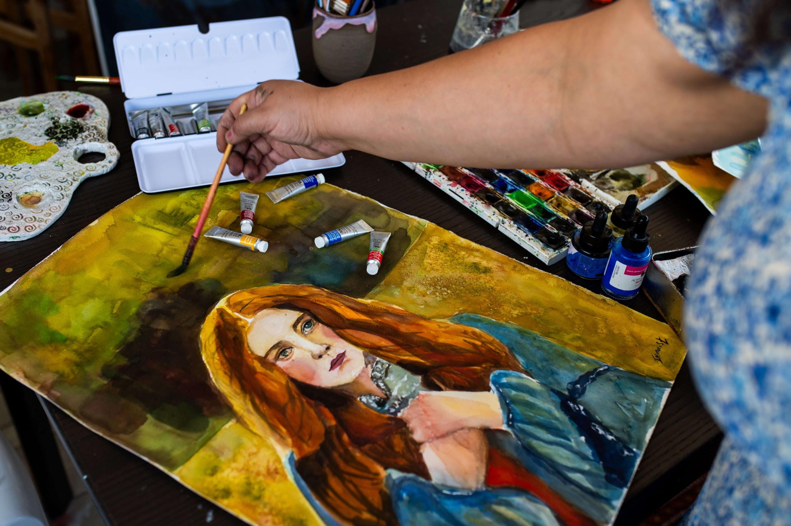 Portrait of a red-haired woman, handmade painting on cotton paper